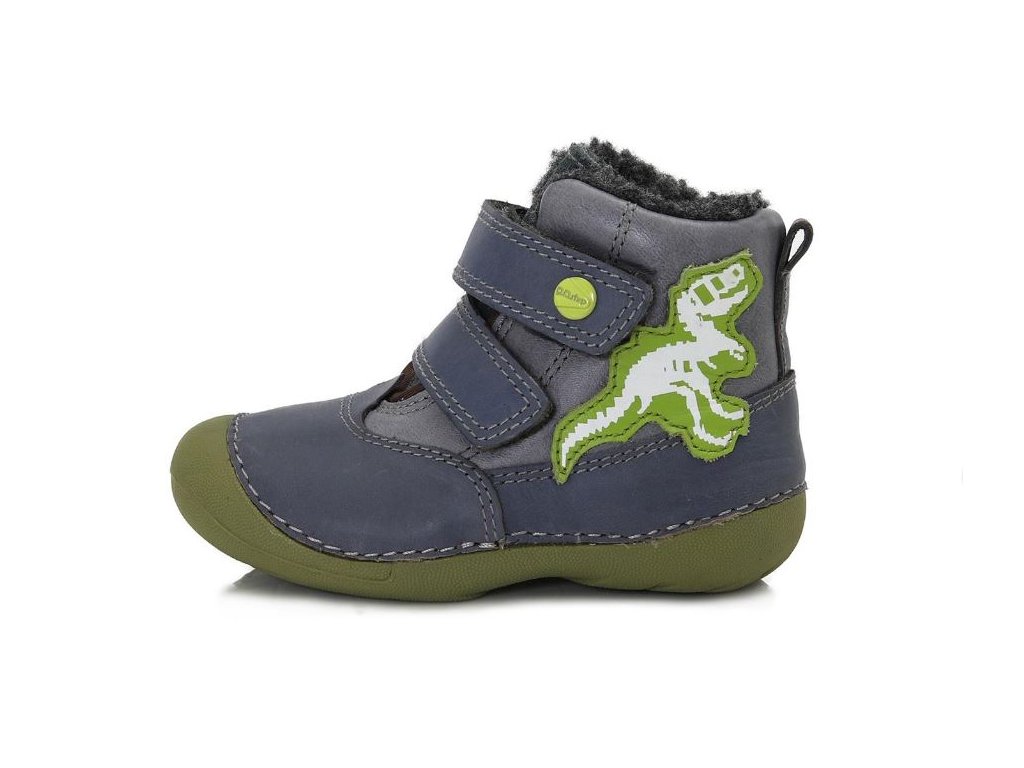 Dětské zimní barefoot/kompromisní boty, tedy boty s tenkou a ohebnou podrážkou a dostatkem místa pro prsty, značky D.D. Step se dvěma suchými zipy, v modré barvě, s motivem dinosaura. Tepý kožíšek uvnitř. Zvýšená gumová špička chrání proti okopání. Díky ohebné podrážce vhodné i jako první botičky.