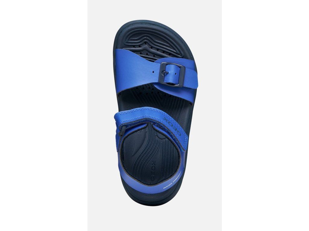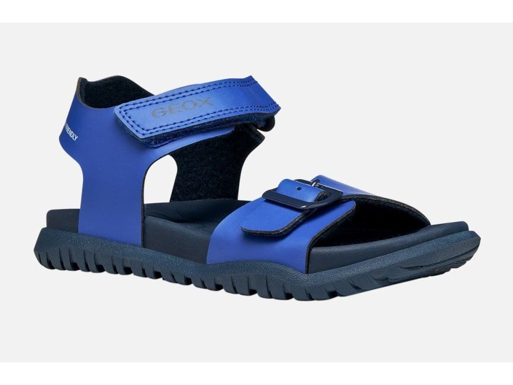 Lehké a odolné dětské sandále Geox Fusbetto v chlapecké barevné kombinaci Royal Navy- moderní modrá barva. Stélka je z materiálu který se nezahřívá a nebude tak na slunci pálit. Mají měkkou a ohebnou podrážku.