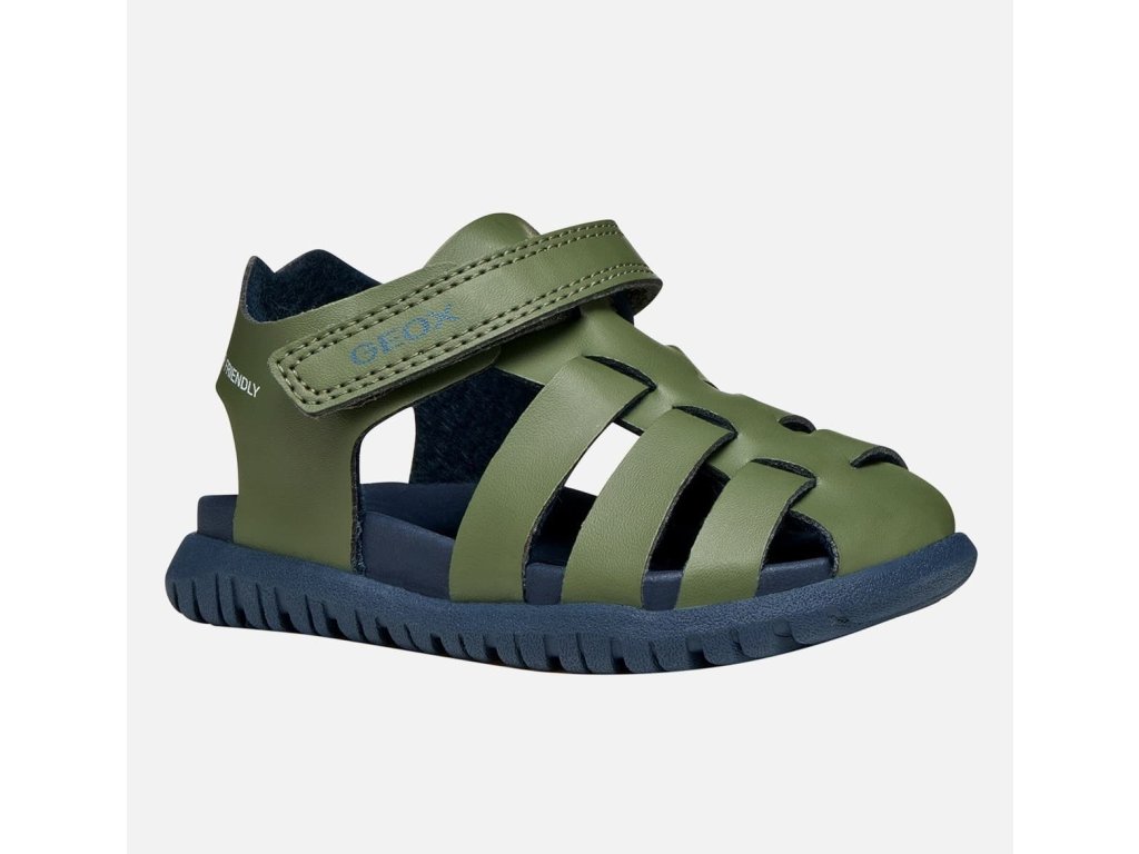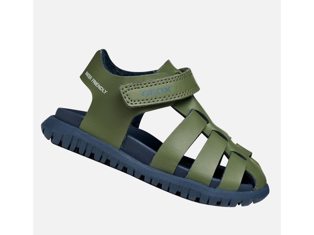 Lehké a odolné dětské sandále Geox Fusbetto v chlapecké barevné kombinaci Sage/Navy - moderní zelená na vrchu a spodní část v modré navy, stélka je z materiálu který se nazahřívá a nebude tak na slunci pálit. Mají měkkou a ohebnou podrážku.