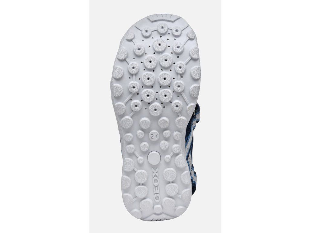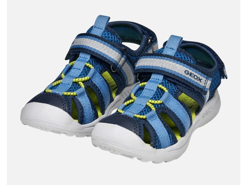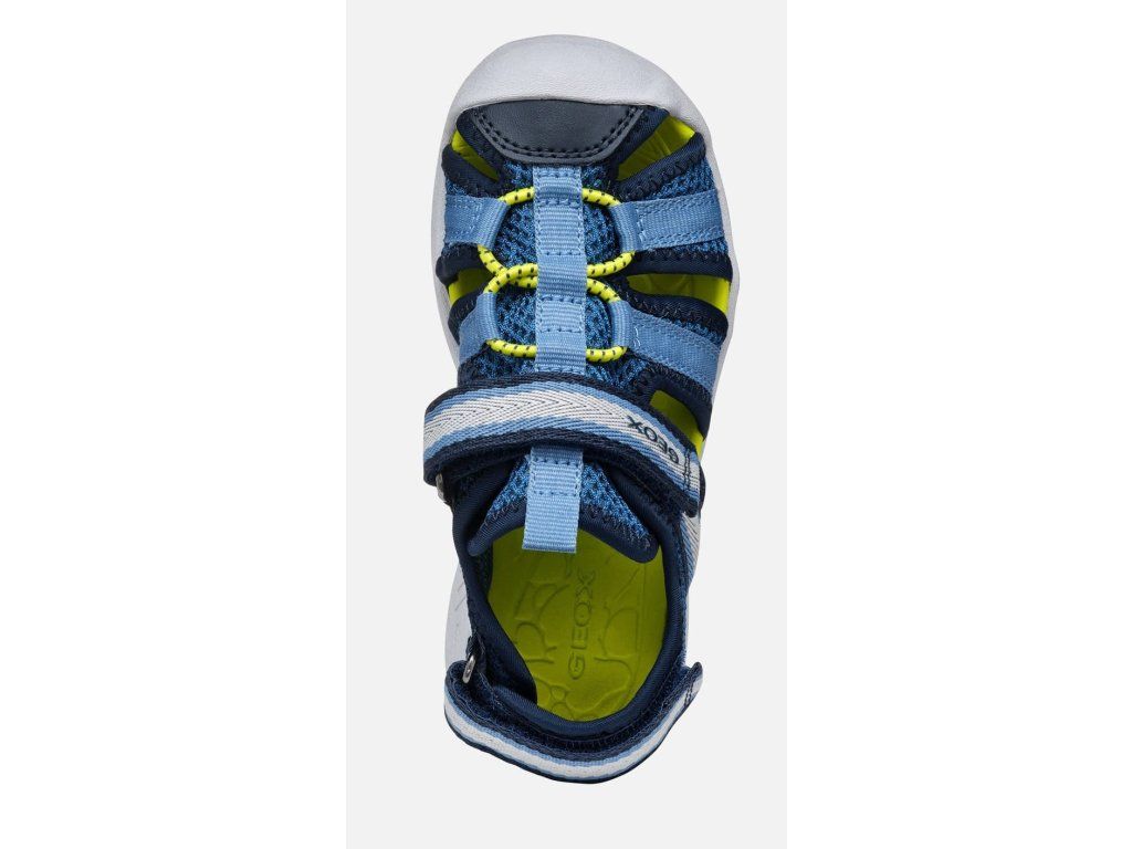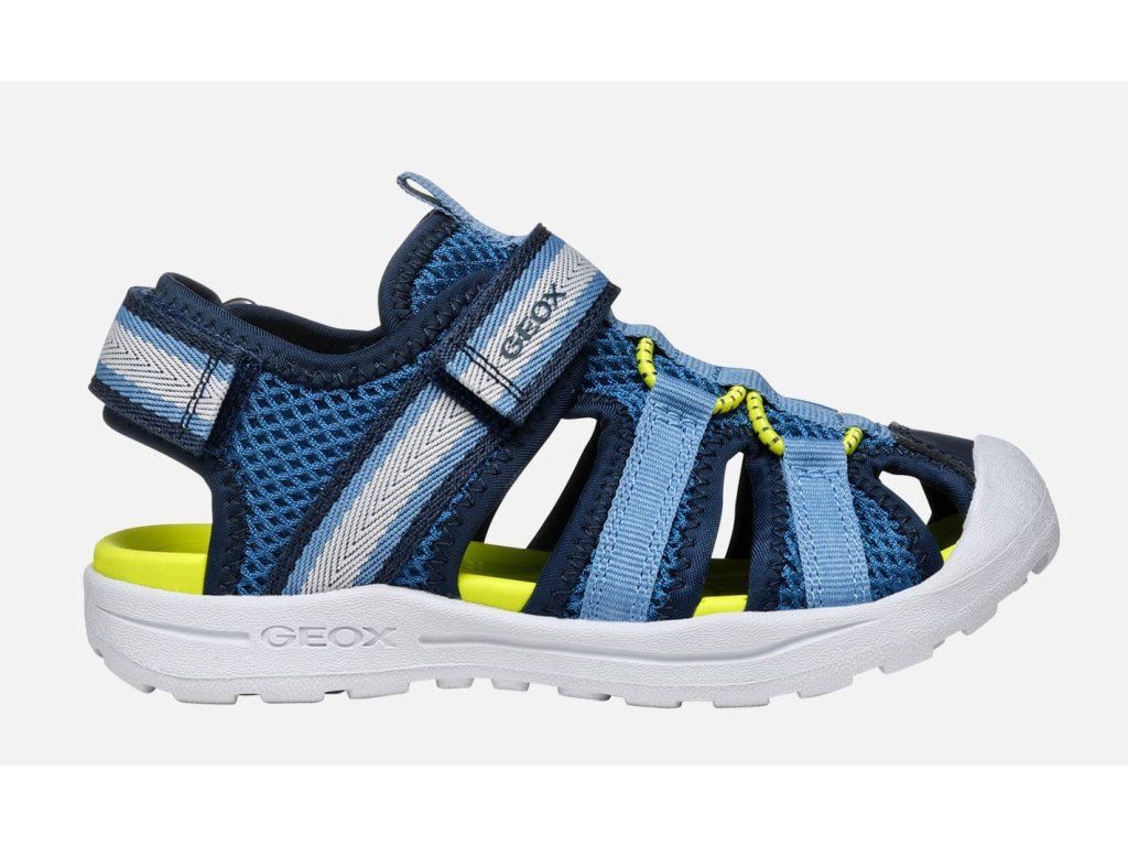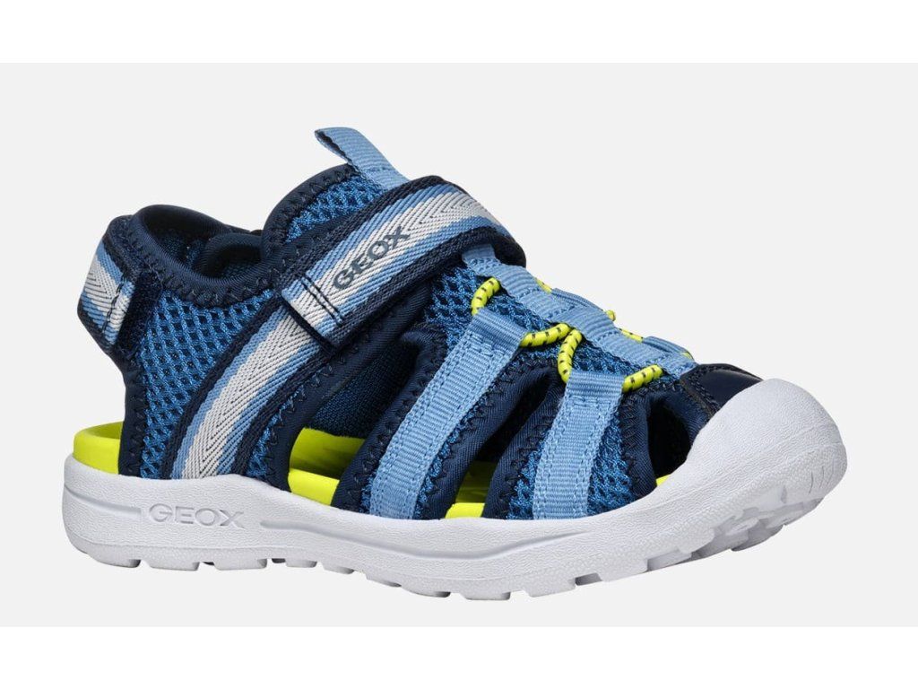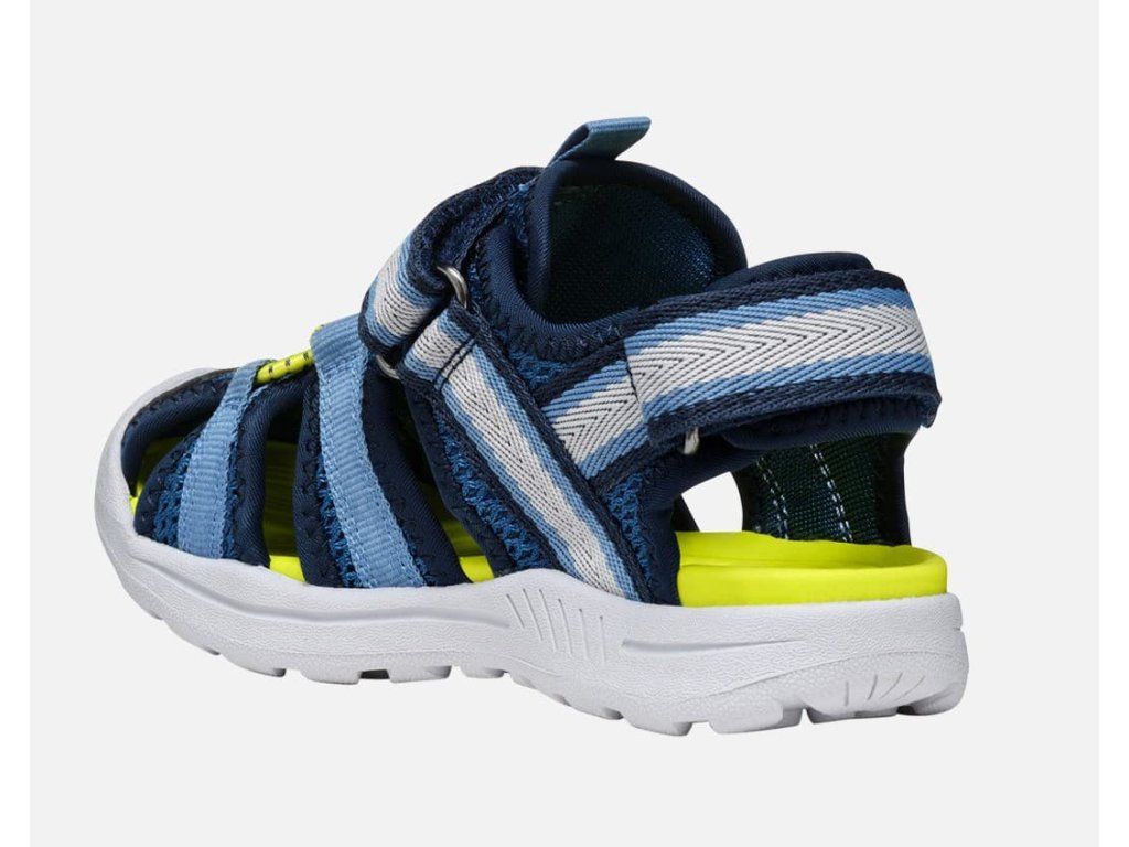 Lehké a odolné dětské sportovní sandálky Geox Vaniett 555XA01454C0693 v unisex barevné kombinaci tmavě a světle modré barvy se žlutou stélkou, která nebude na slunci pálit. Mají měkkou a ohebnou podrážku, obdobně jako Keen Seacamp CNX, a jsou vhodné na úzké nožky. Na veškeré letní aktivity, i ty ve vodě :-)