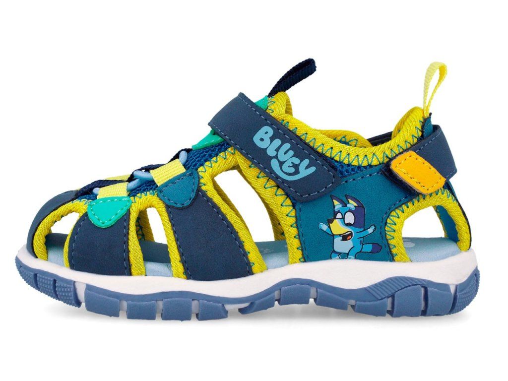 Dětské sandálky Garvalín 262858-A008 Azul s Bluey v modré barvě Azul v kombinaci se žlutými detaily jsou perfektně zpracované a lehounké sandále. Svršek tvoří imitace kůže a textil, podšívka i stélka jsou z příjemného prodyšného mikrovlákna. Špička má zesílenou ochranu proti okopu a skvěle tak chrání prstíky vašeho malého chodce.