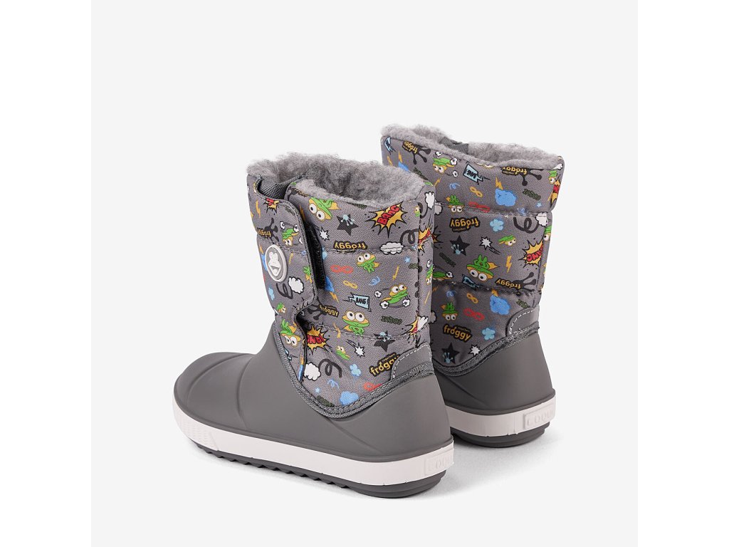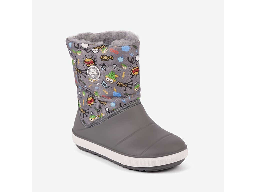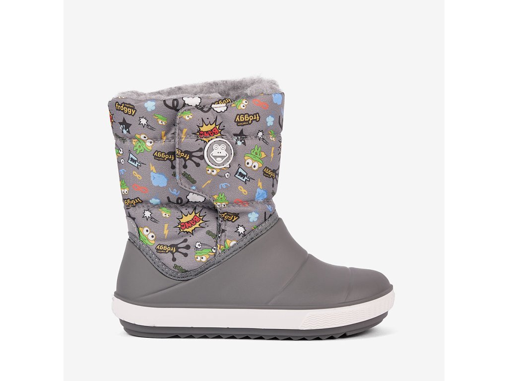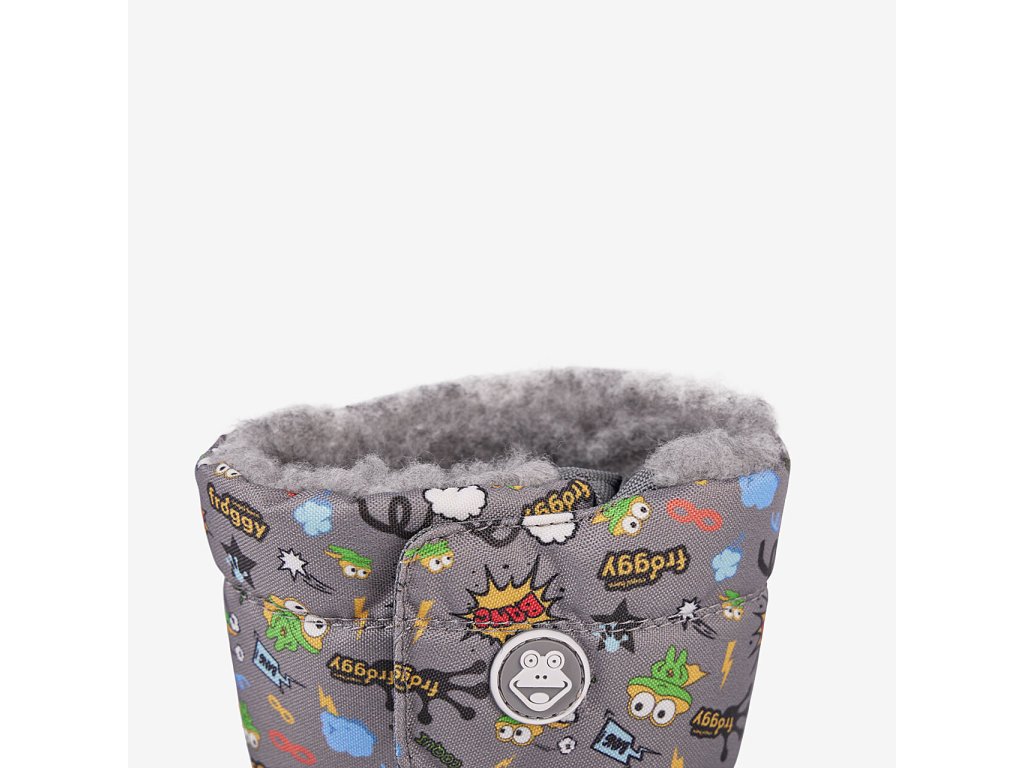 Dětské sněhule Coqui Miki 5045 Dk.Grey Hero. V nové variantě s lepším tvarem, který více odpovídá skutečnému tvaru nohy. Teplé dětské sněhulky se zapínáním na suchý zip, které usnadňuje nazouvání a jde pomocí něj částečně regulovat šířka horní části. Zateplené jemným nekousavým kožíškem, vrchní část z odolné textilie, spodní polovina ze syntetické gumy. Šedé barevné provedení s motivem dinosaurů pro chlapečky.