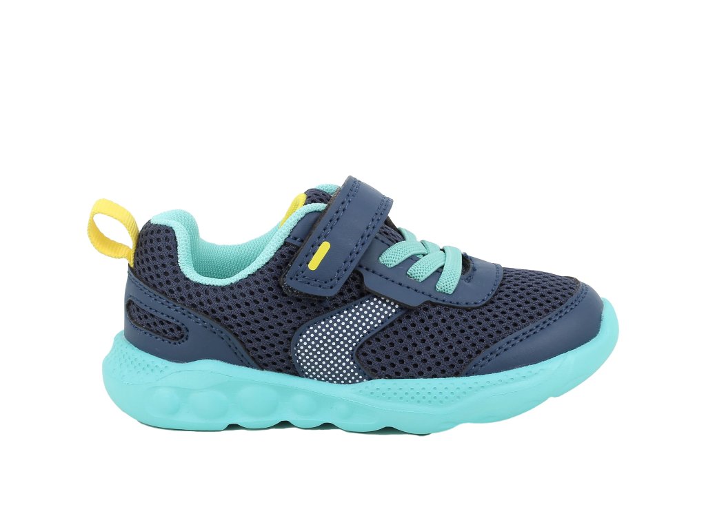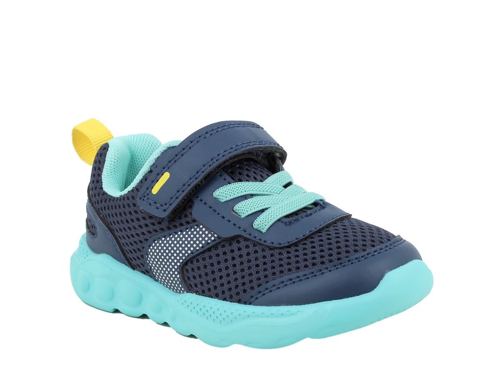 Lehké dětské tenisky Primigi 1452822 v tmavě modré barvě s kontrastními tyrkysovými detaily. Podrážka je velmi lehká a dobře ohebná. Boty jsou zároveň výborně prodyšné.