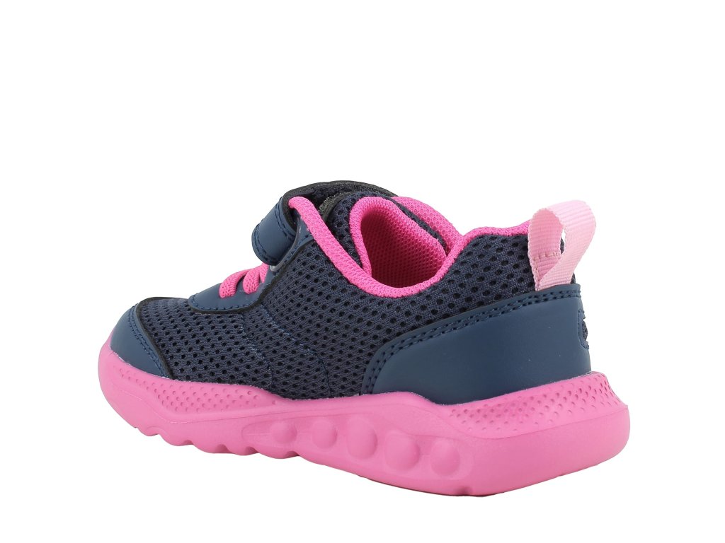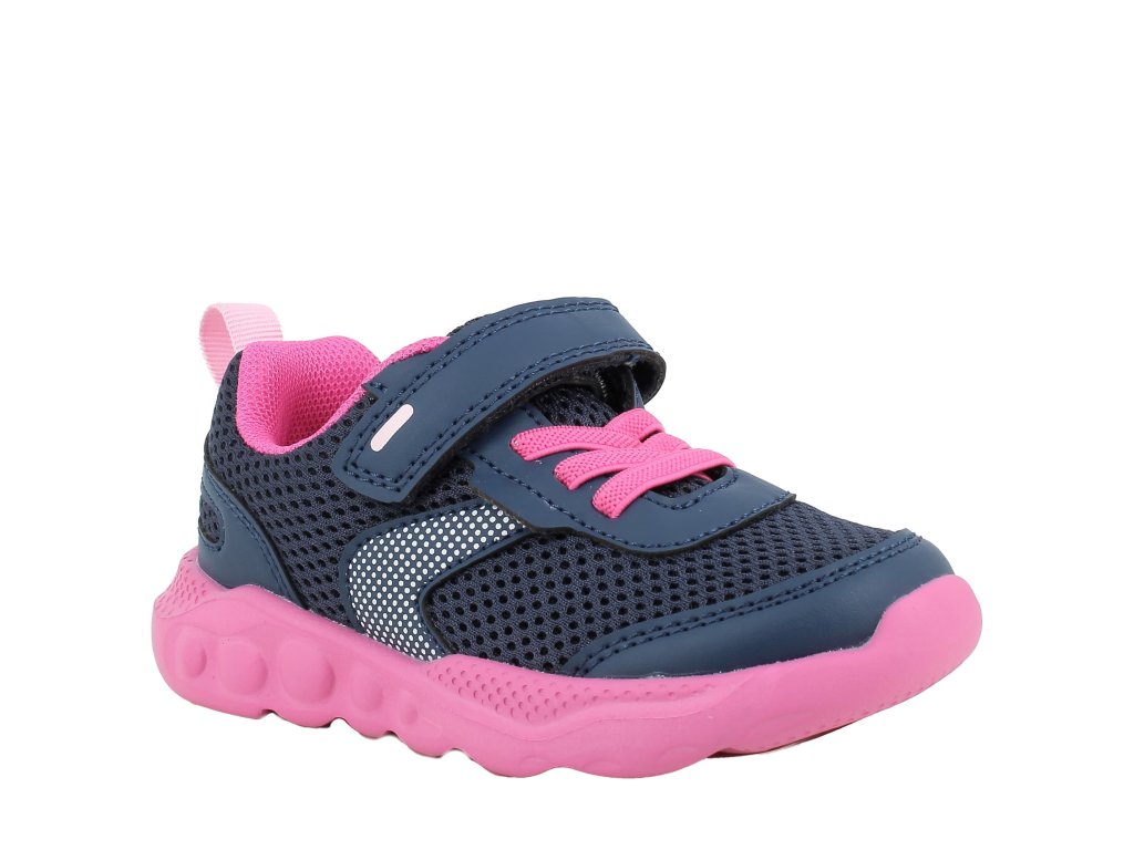 Lehké dětské tenisky Primigi 1452877 v tmavě modré barvě s kontrastními růžovými detaily. Podrážka je velmi lehká a dobře ohebná. Boty jsou zároveň výborně prodyšné.