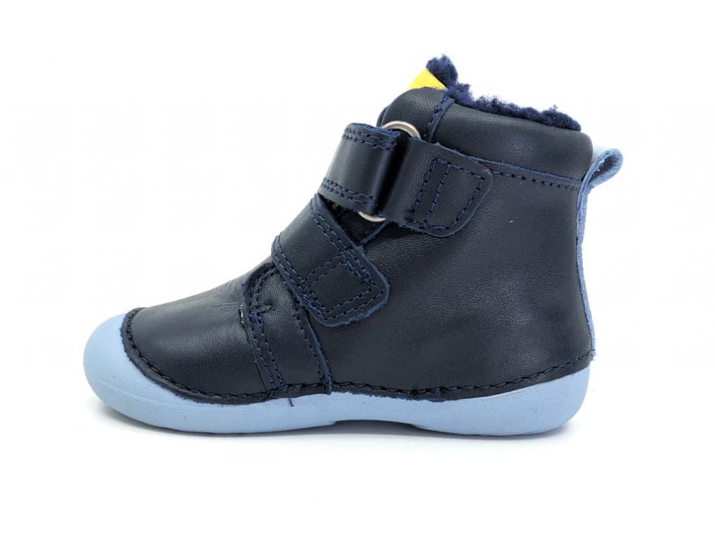 Dětské zimní boty DD step W015-953B Royal Blue z kompromisní/barefoot řady v tmavě modré barvě a motivem papouška na vnější straně. Boty jsou lehce nadkotníkové, uvnitř mají teploučký kožíšek. Velmi měkká a ohebná podrážka, krásně se přizpůsobí v chůzi, proto je vhodná i pro ty nejmenší chodce. Špička i pata je vyvýšená, chrání proti okopu. Díky dvěma suchým zipům lze boty krásně rozevřít, usnadňují tedy obouvání a dají se přizpůsobit v oblasti nártu i kotníku. Boty jsou z hladké kůže, kterou lze snadno otřít, a snadno se tak udržují.