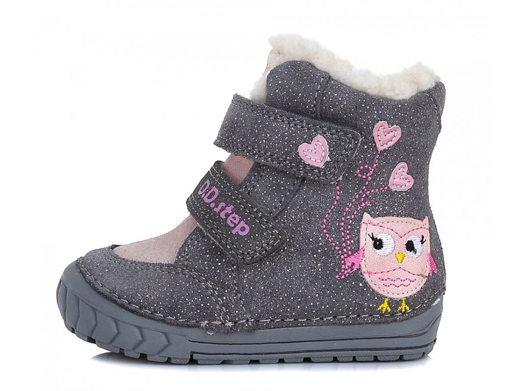 Dětské zimní boty DDstep W029-362 Dark Grey vyššího střihu, sahají několik cm nad kotníky. Hřejivý kožíšek uvnitř celé boty zajistí teplo v zimním období. Vyjímatelná pěnová stélka s nášlapem z kožíšku. Podrážka je měkká, ohebná a v přední části je vyvýšená - chrání tak boty proti okopu. Opatek je zpevněný, drží nožky v ose a zabraňuje tak vtáčení kotníků dovnitř. Boty mají dva suché zipy, pomocí kterých se dají krásně regulovat v oblasti nártu i kotníku. V šedé barvě s vyšitou sovičkou na boku a starorůžovými detaily.