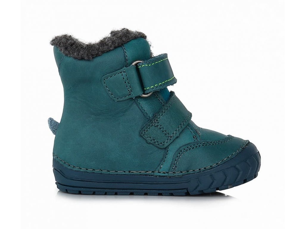 Dětské zimní boty DDstep W029-394B Bermuda Blue vyššího střihu, sahají několik cm nad kotníky. Hřejivý kožíšek uvnitř celé boty zajistí teplo v zimním období. Vyjímatelná pěnová stélka s nášlapem z kožíšku. Podrážka je měkká, ohebná a v přední části je vyvýšená - chrání tak boty proti okopu. Opatek je zpevněný, drží nožky v ose a zabraňuje tak vtáčení kotníků dovnitř. Boty mají dva suché zipy, pomocí kterých se dají krásně regulovat v oblasti nártu i kotníku. V modrozelené barvě s veselým motivem dinosaura.