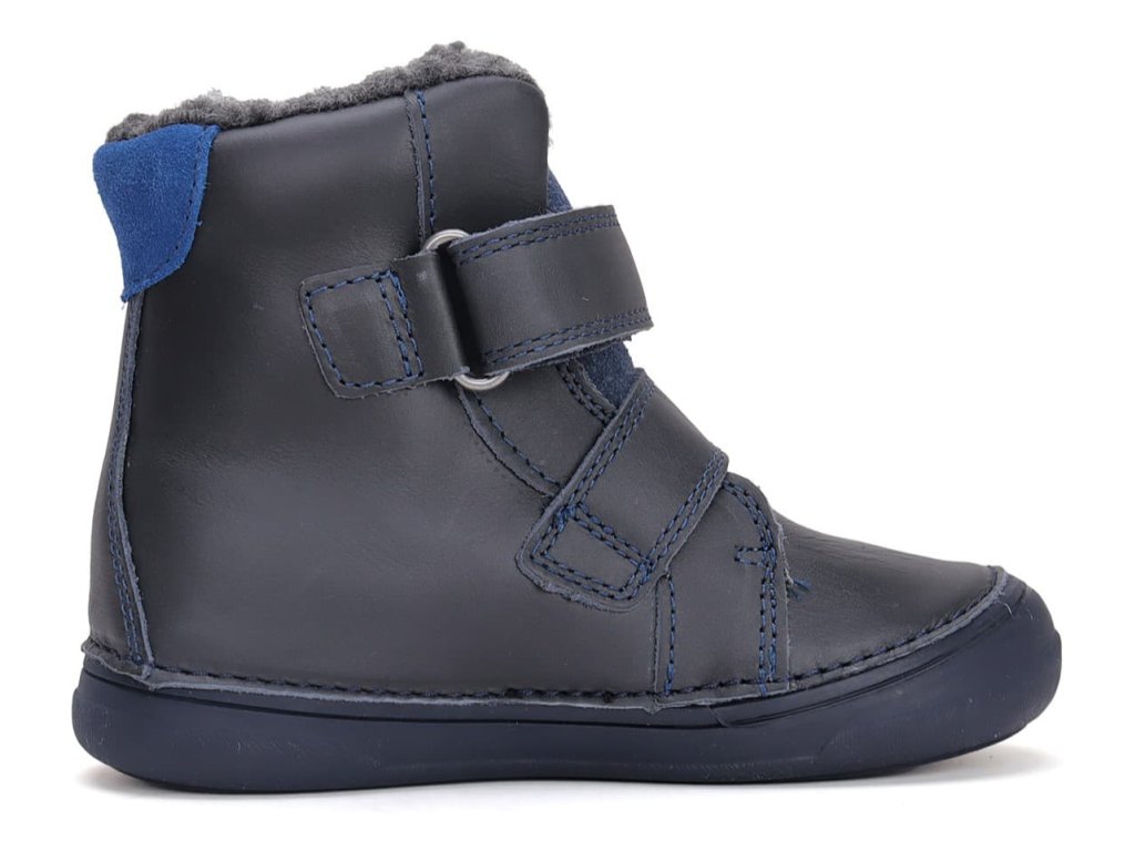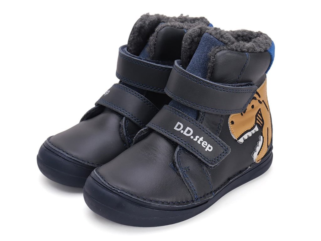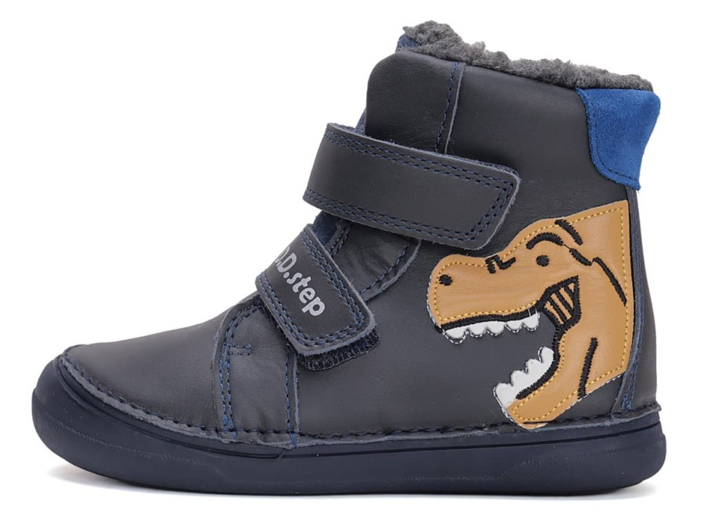 Dětské zimní boty DD Step W078-42761A s motivem dinosaura pro všechny malé hrdiny. Měkké, pohodlné boty vyššího střihu s hřejivým kožíškem uvnitř celé boty. Svršek je z hladké kůže, která se velmi dobře udržuje. Vyjímatelná pěnová stélka pro možnost kontroly velikosti s kožíškovým nášlapem. Prostorná, poměrně široká špička pro volný pohyb prstů v botě a zároveň pevný opatek zamezující "šmajdání". Dva suché zipy pro lepší regulaci v oblasti nártu a kotníku. Podrážka je poměrně tenká a ohebná, hlavně ve směru chůze, zateplení od spodu je dosaženo zejména silnou vrstvou kožíšku na vnitřní stélce.
