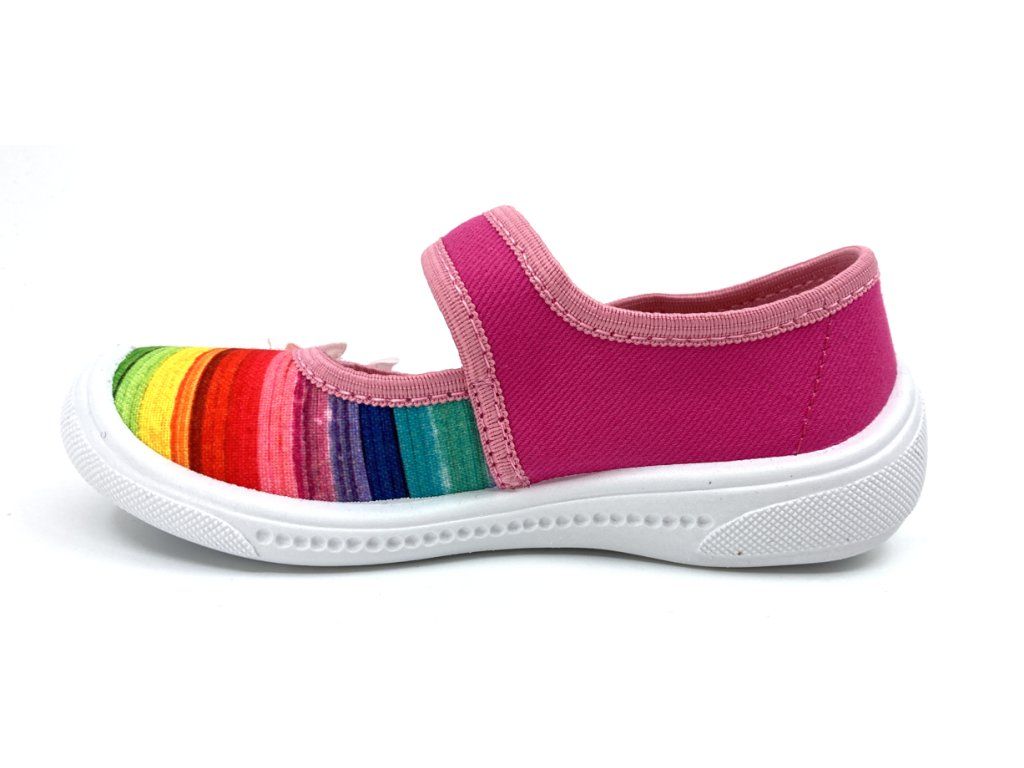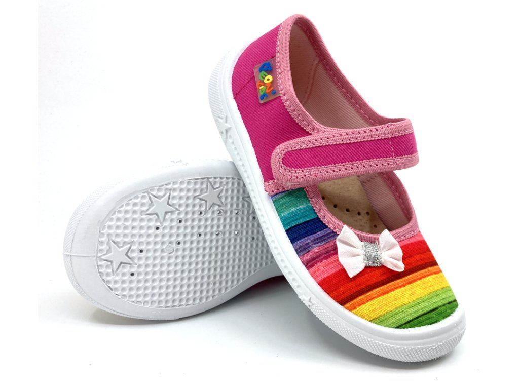 Veselé duhové dívčí bačkory Peon s se zapínáním na suchý zip. Jdou tak perfektně přizpůsobit nožce v oblasti nártu. Jsou ideální volbou jako školní přezůvka nebo domácí obuv, přezůvky se díky pásku snadno nazouvají. Veselý duhový design.