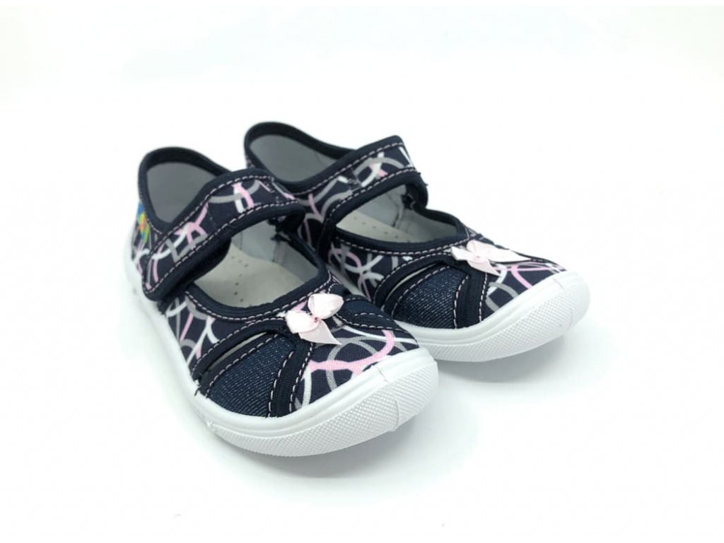 Stylové dívčí bačkory Peon MI/011 AD v tmavě modré barvě, pastelovými kroužky a růžovou mašličkou. Díky suchému zipu jdou perfektně přizpůsobit kolem kotníku. Jsou ideální volbou jako školní přezůvka nebo domácí obuv, přezůvky se díky pásku snadno nazouvají.