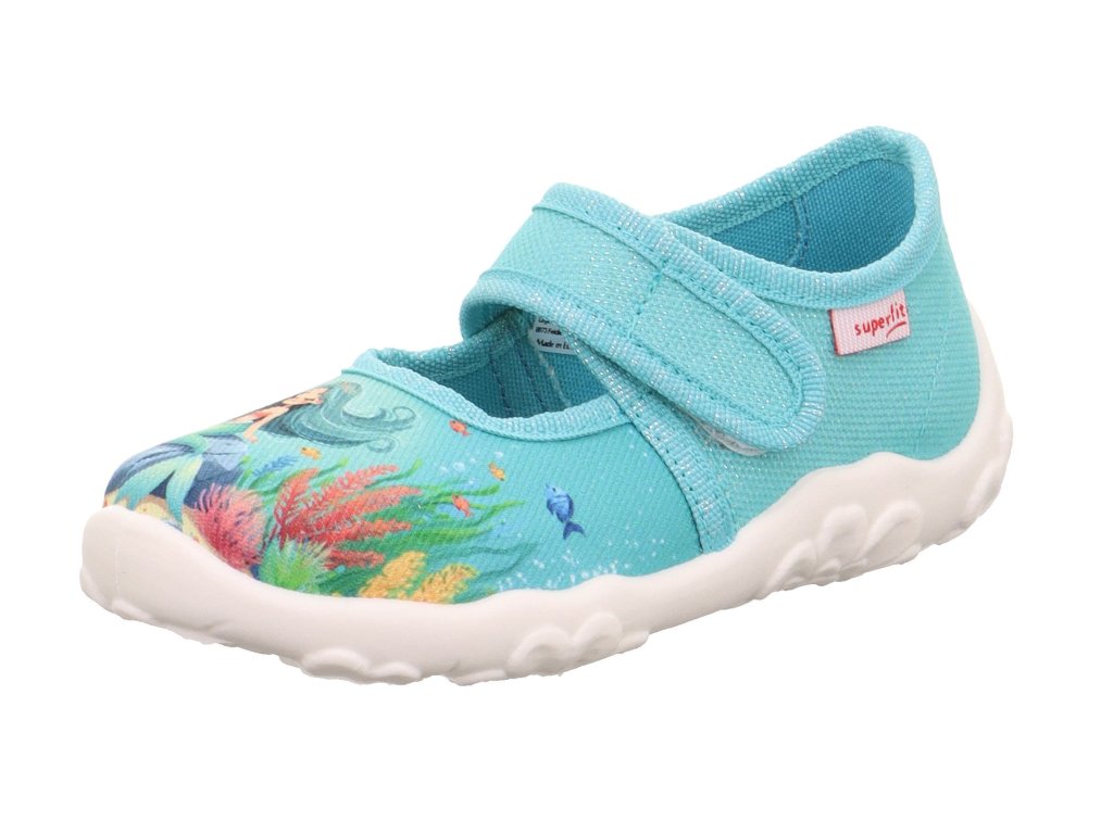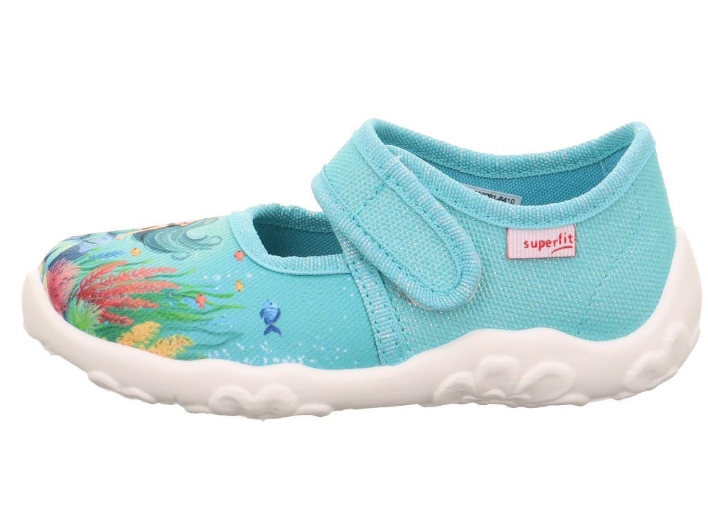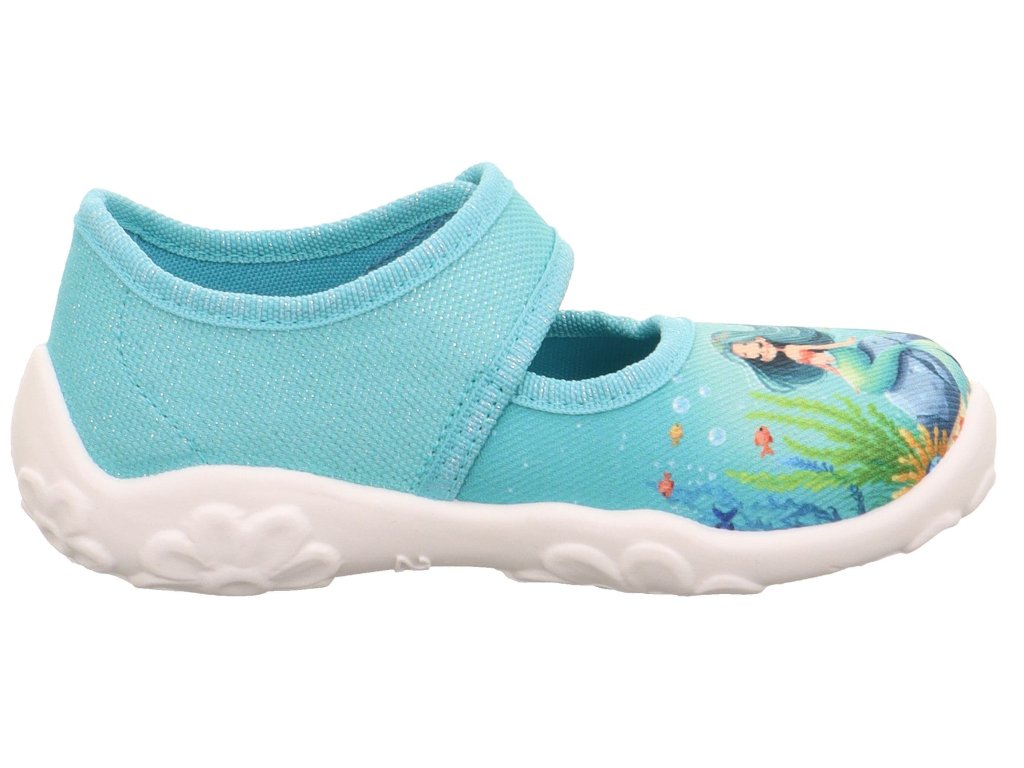 Dívčí bačkory - balerínky Superfit Bonny 1-000281-8410 v modré barvě s motivem mořské panny a bílou podrážkou.