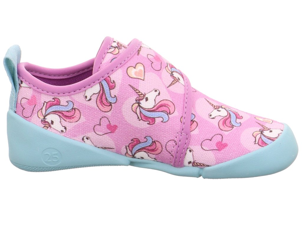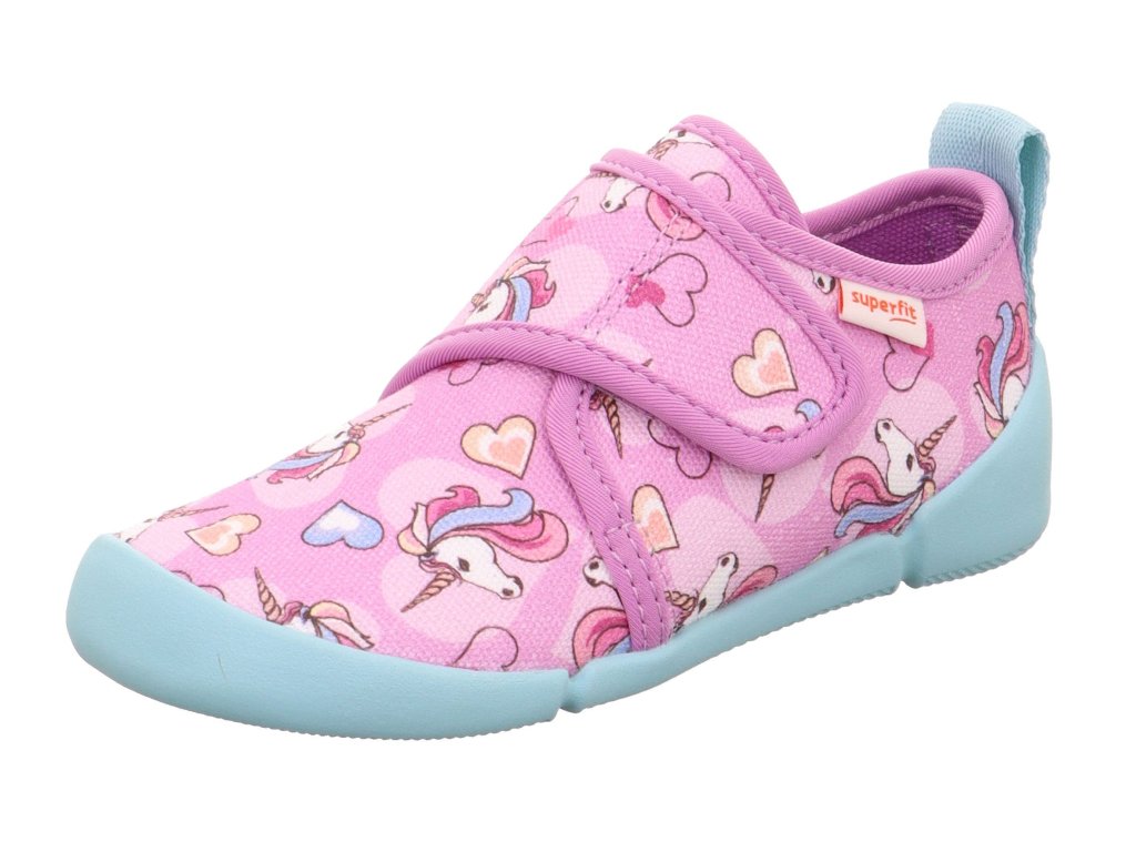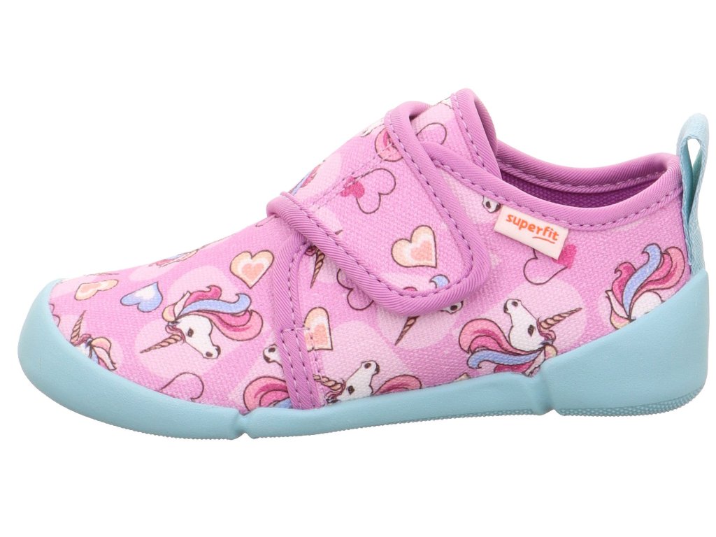 Dívčí barefoot botičky Superfit Venti 1-006700-5500 v růžové barvě s jednorožcem a srdíčky. Tyto velmi lehké boty jsou vhodné do školy či školky, ale použitelné i na běhání venku při teplém počasí.