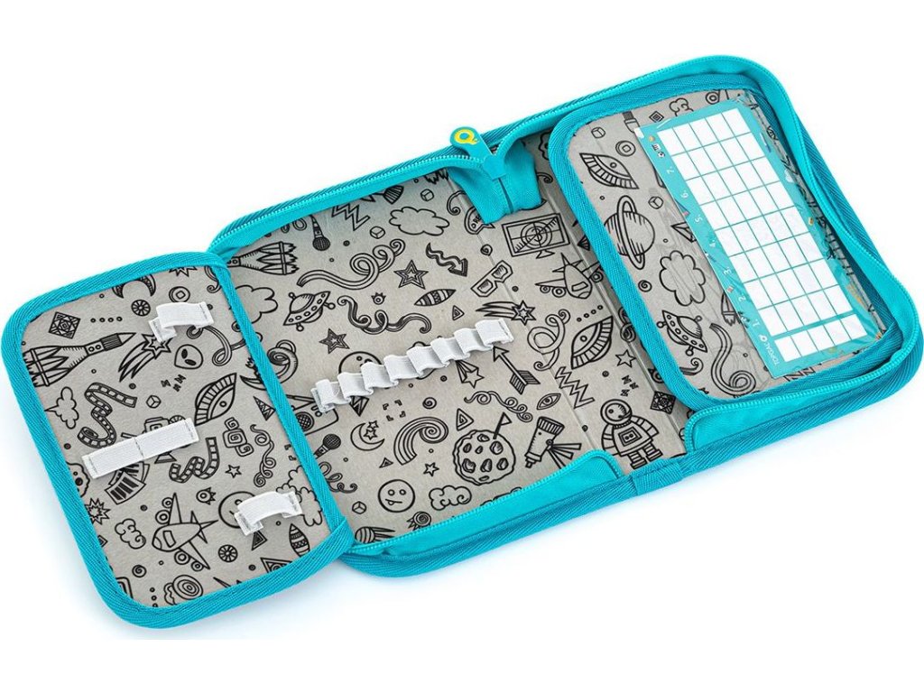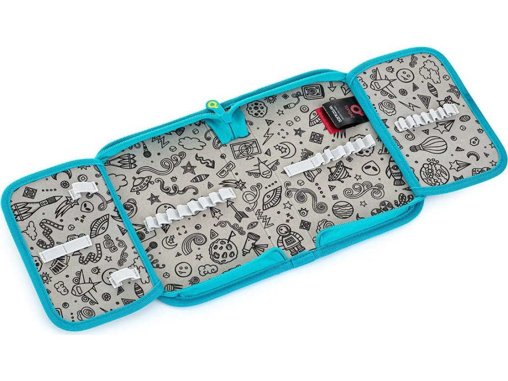 Jednopatrové školní pouzdro se dvěma klopnami je vybaveno 21 klasickými gumovými úchyty na pastelky a fixy, třema širšími úchyty na pravítko, kružítko či nůžky a dvěma většími úchyty na gumu a ořezávátko. Pod klopou z průhledné folie najdete rozvrh hodin, druhé poslouží třeba i na taháky :-)