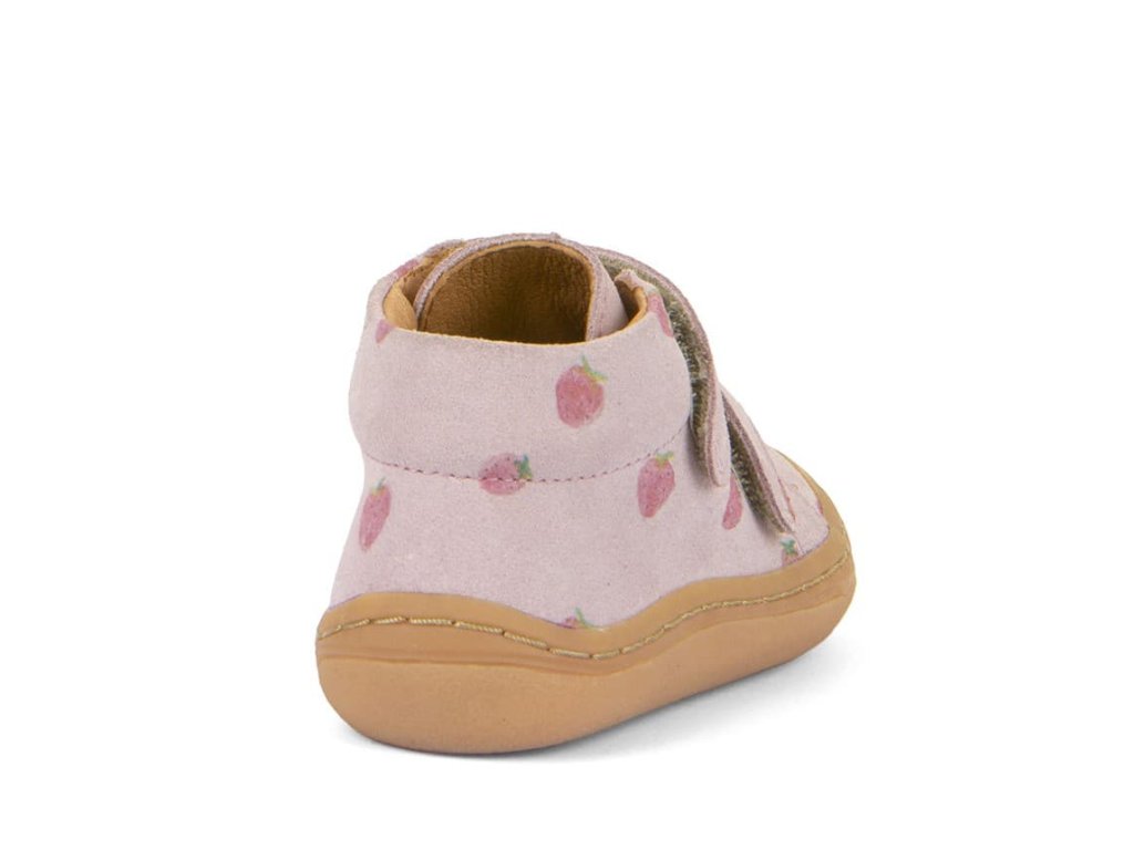 Stylové barefoot tenisky Froddo G2130342-29 Pink - nová varianta z broušené kůže s veselým motivem jahod. Celoroční barefoot boty Froddo se střední výškou a původní Froddo podrážkou prakticky bez vzorku. Boty tak končí na kotníku a jsou vhodné na jaro, podzim, ale i deštivé dny v létě. Kombinují stylový design a snadné nazouvání i pro děti. Vrchní část boty je kompletně kožená, a stejně tak i podšívka je z jemné kůže. Praktické zapínání na suchý zip umožňuje snadné nazouvání i dětem. Podrážka je z přírodní gumy, prakticky bez vzorku.