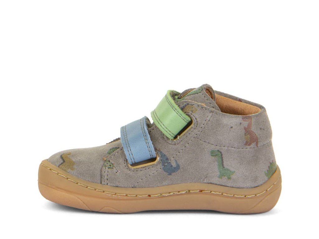Stylové barefoot tenisky Froddo G2130342-36 Grey - nová varianta z broušené kůže s oblíbeným motivem dinosaurů. Celoroční barefoot boty Froddo se střední výškou a původní Froddo podrážkou prakticky bez vzorku. Boty tak končí na kotníku a jsou vhodné na jaro, podzim, ale i deštivé dny v létě. Kombinují stylový design a snadné nazouvání i pro děti. Vrchní část boty je kompletně kožená, a stejně tak i podšívka je z jemné kůže. Praktické zapínání na suchý zip umožňuje snadné nazouvání i dětem. Podrážka je z přírodní gumy, prakticky bez vzorku.