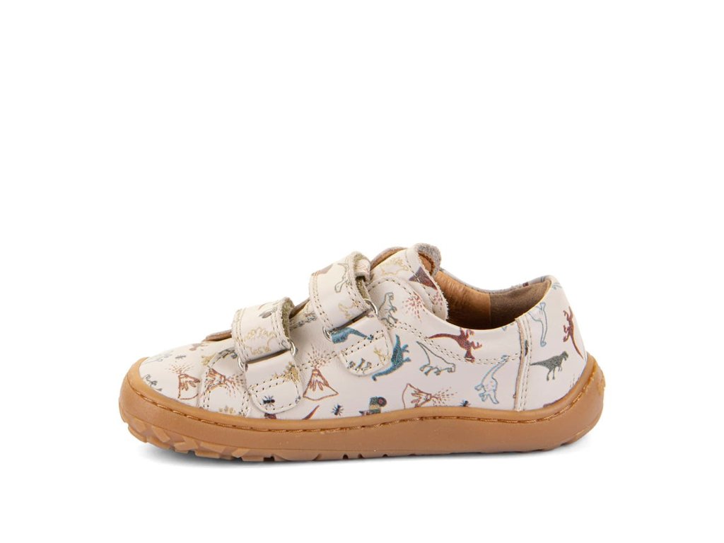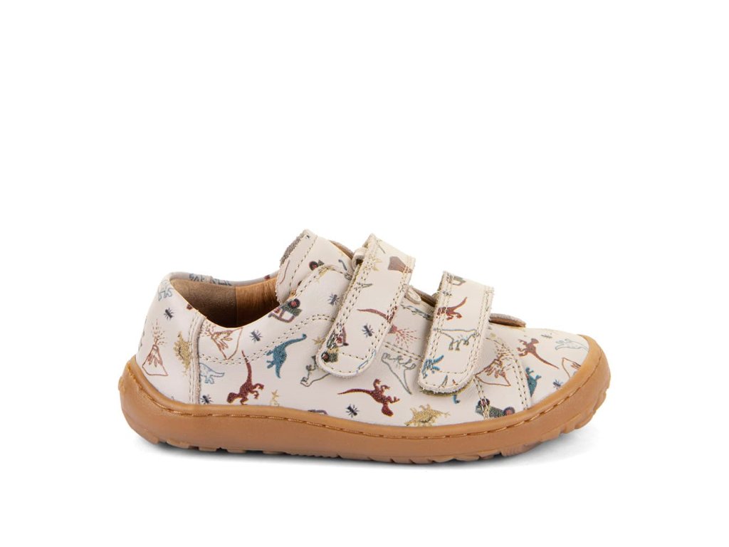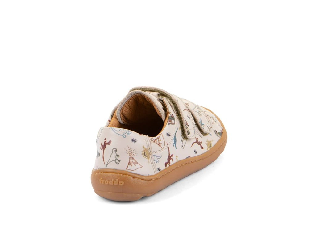 Stylové barefoot tenisky Froddo G3130284-20 Beige s oblíbeným motivem dinosaurů kombinují stylový design a snadné nazouvání i pro děti. Vrchní část boty je kompletně kožená, a stejně tak i podšívka je z jemné kůže. Praktické zapínání na suchý zip umožňuje snadné nazouvání i dětem. Podrážka je z přírodní gumy.