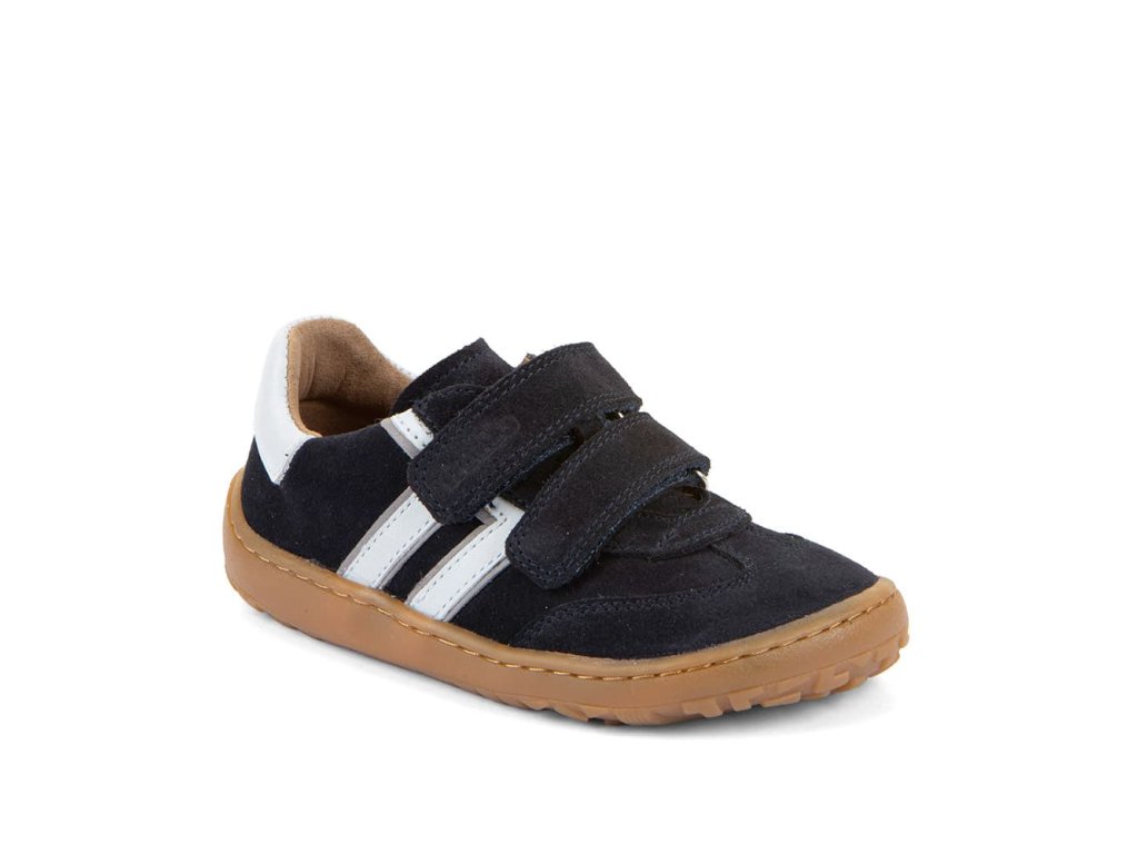 Stylové barefoot tenisky Froddo G3130292-4 Dark Blue - tmavě modré s bílou kombinují stylový design a snadné nazouvání i pro děti. Vrchní část boty je v kombinaci hladké a broušené kůže, a stejně tak i podšívka je z jemné kůže. Praktické zapínání na suchý zip umožňuje snadné nazouvání i dětem. Podrážka je z gumy. Vhodné na jaro, léto i teplejší podzim.