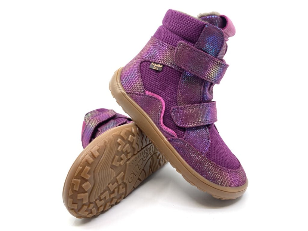 Vyšší zimní boty Froddo Barefoot G3160247-11 Multicolor mají vnější část částečně z kůže pro optimální odolnost a textilních materiálů pro maximální možnou prodyšnost. Nepromokavost zajišťuje membrána Froddo-Tex. Zateplené pravou ovčí vlnou - podšívka i stélka. Speciální verze s oblíbenou třpytivou úpravou.