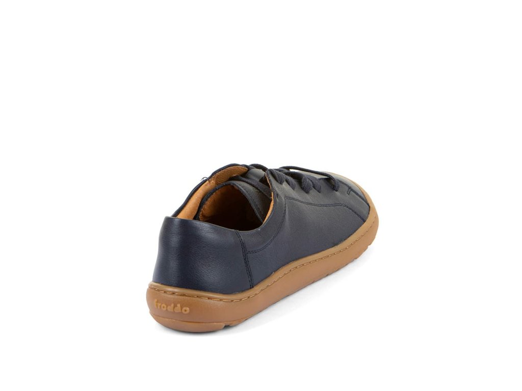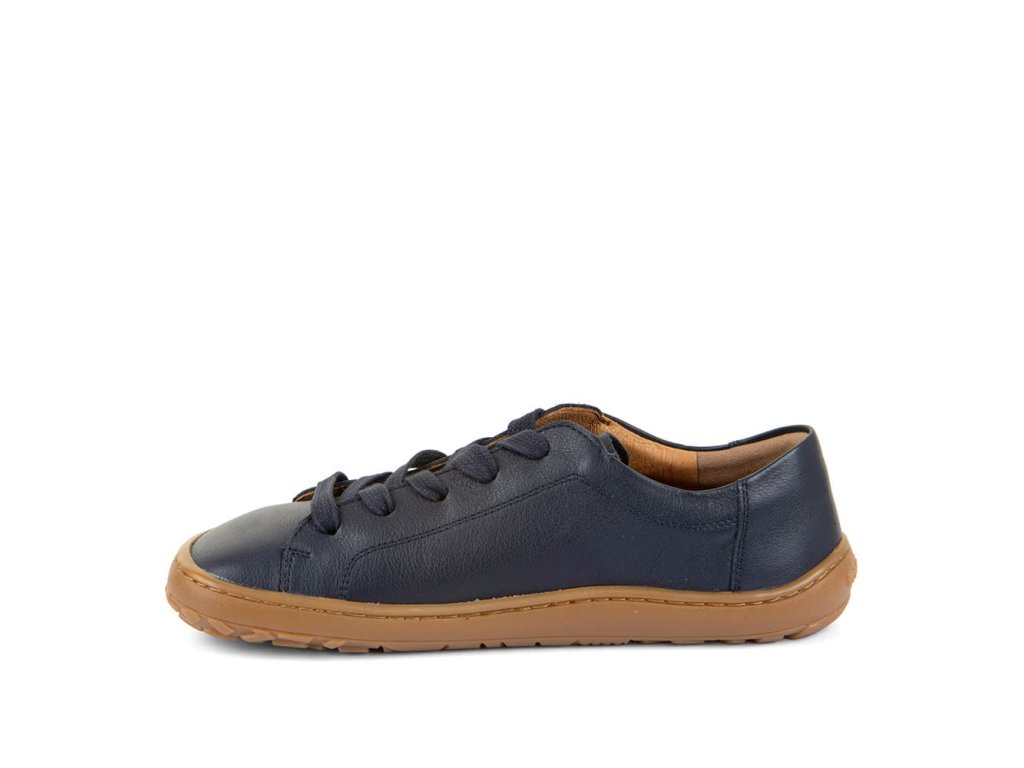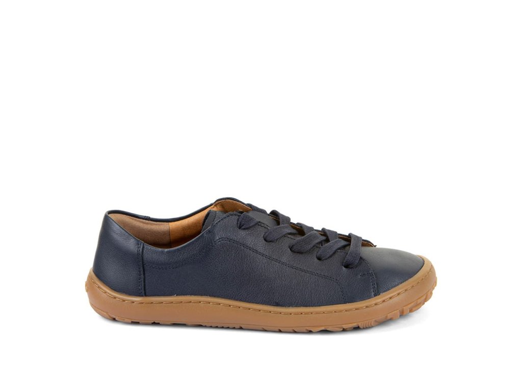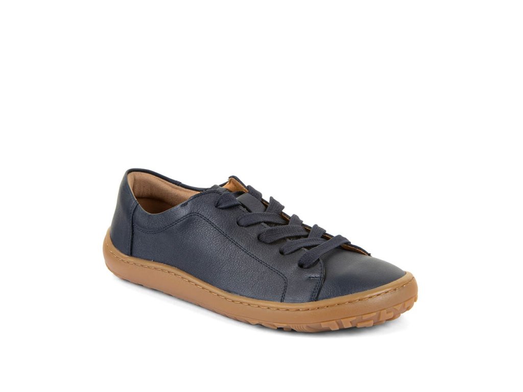 Kožené šněrovací barefoot tenisky Froddo Laces G3130294-2 Dark Blue mají jednoduchý a stylový design - tmavě modrá hladká kůže s klasickými tkaničkami a podrážka z přírodní gumy v hnědé barvě.