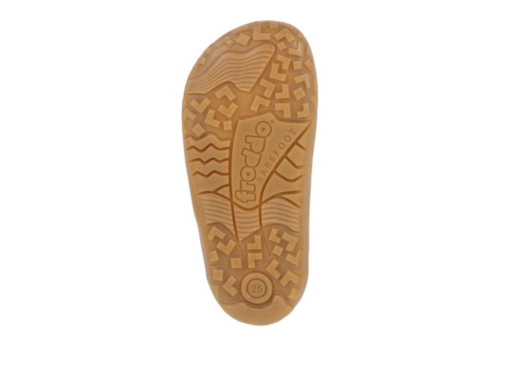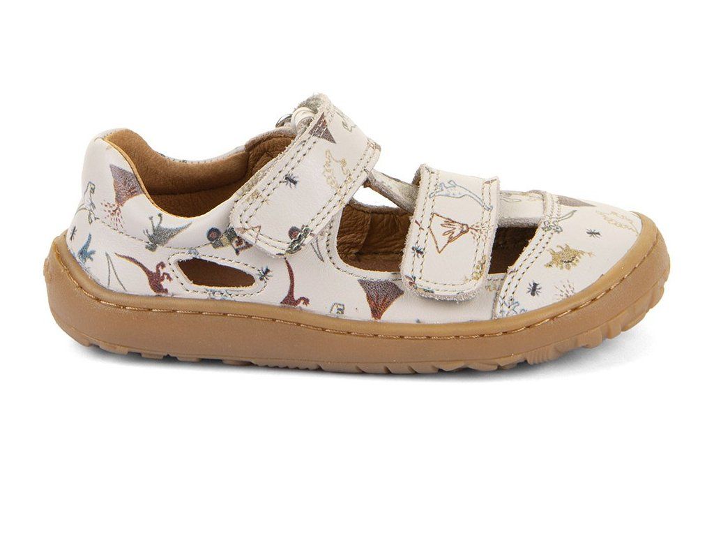 Stylové kožené barefoot sandále Froddo G3150291-16 Beige se zapínáním na suchý zip pro snadné nazouvání. V unisex béžové barvě s motivem dinosaurů. Boty mají flexibilní podrážku z přírodní gumy s jemným vzorkem.
