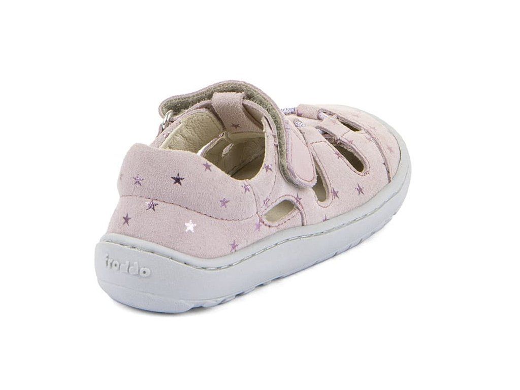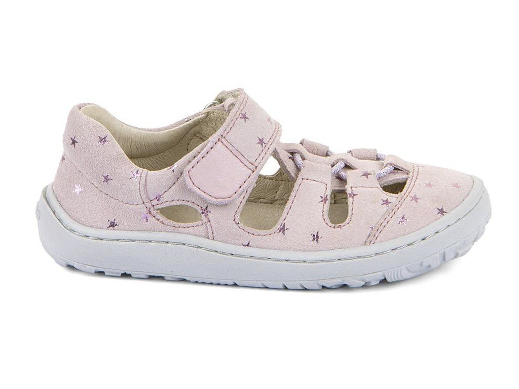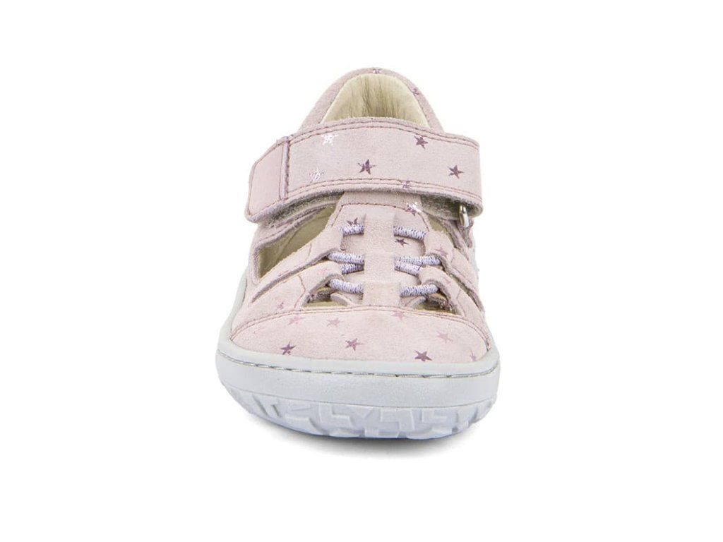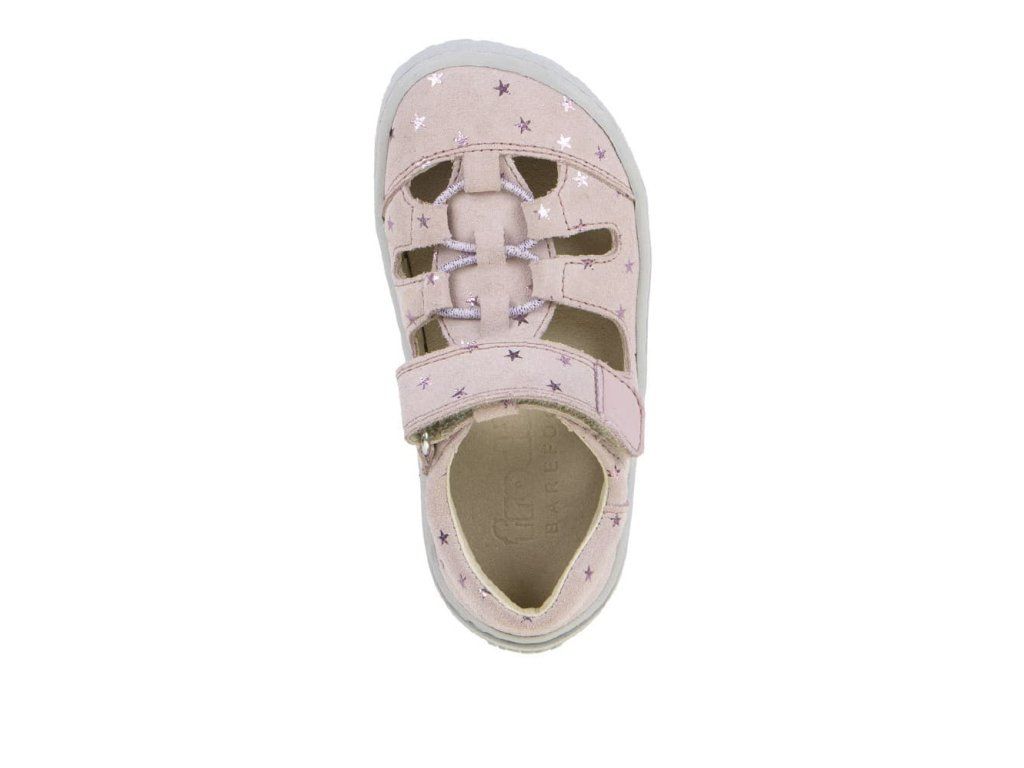Stylové kožené barefoot sandále Froddo G3150290-12 se zapínáním na suchý zip pro snadné nazouvání. Ve spodní části je gumička, která ale nelze nijak utáhnout. V dívčí růžové barvě s motivem hvězdiček. Boty mají flexibilní podrážku z přírodní gumy s jemným vzorkem.