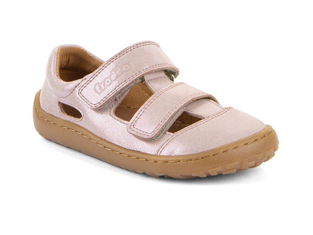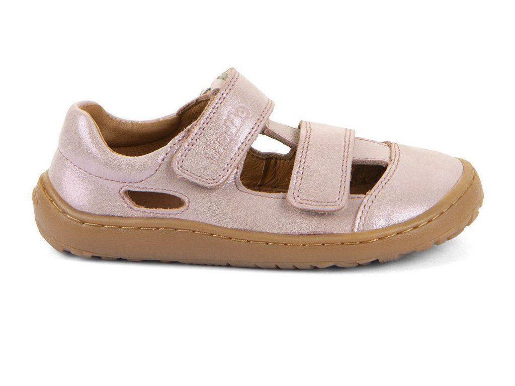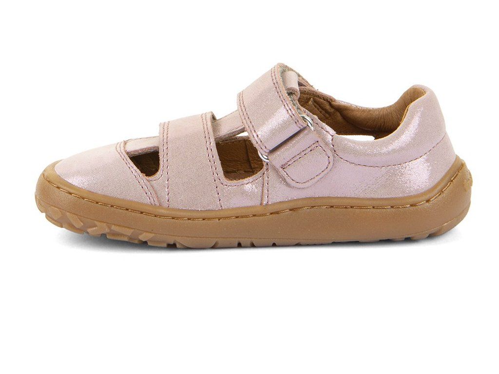 Stylové kožené barefoot sandále Froddo G3150291-10 Pink shine se zapínáním na suchý zip pro snadné nazouvání. V dívčí třpytivé, růžové barvě. Boty mají flexibilní podrážku z přírodní gumy s jemným vzorkem.