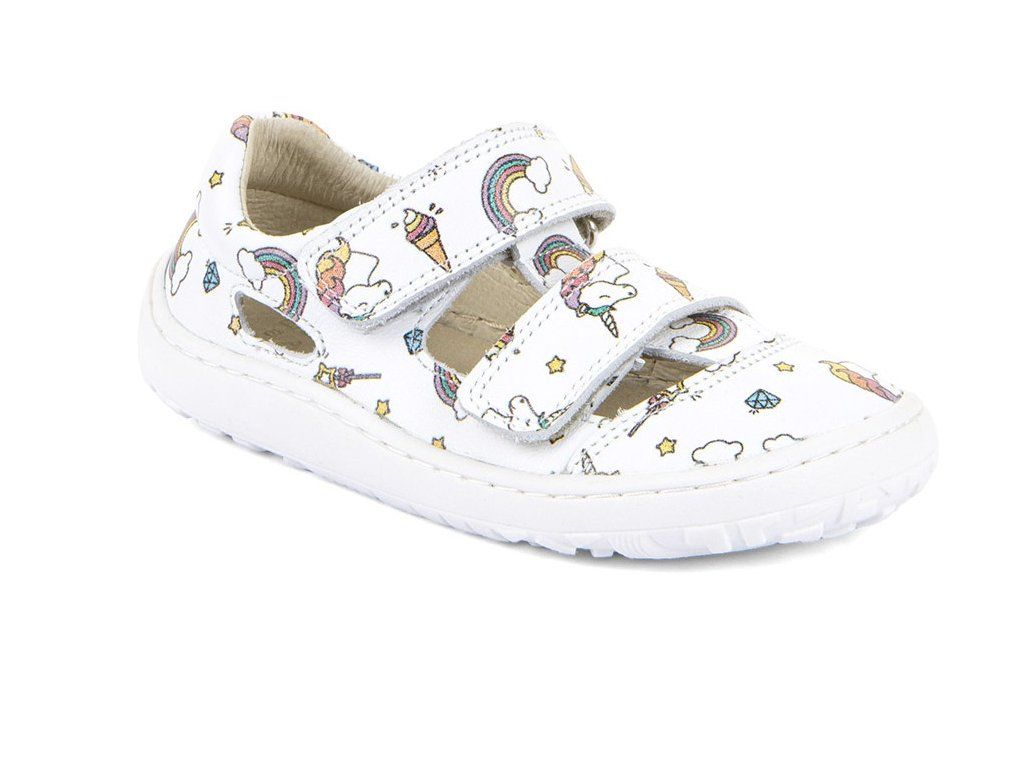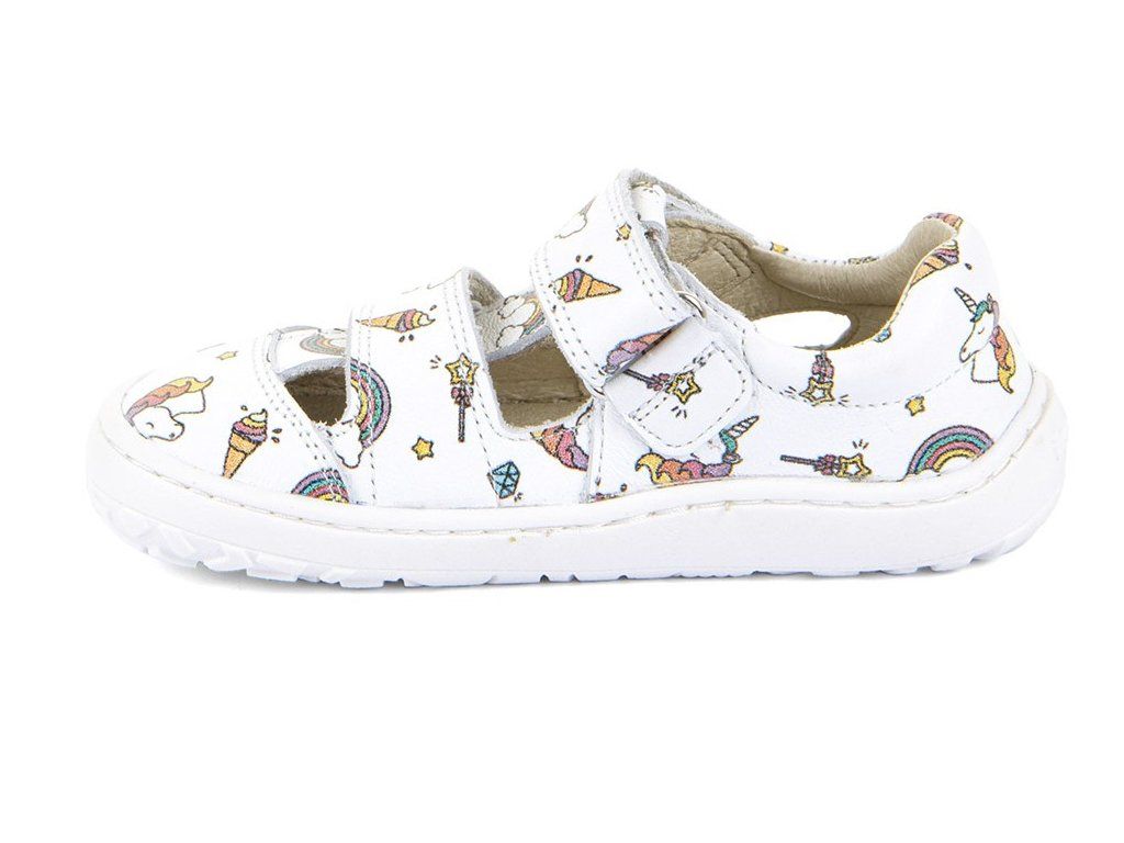 Stylové kožené barefoot sandále Froddo G3150291-13 White+ se zapínáním na suchý zip pro snadné nazouvání. V dívčí bílé barvě s motivem jednorožců. Boty mají flexibilní podrážku z přírodní gumy s jemným vzorkem.