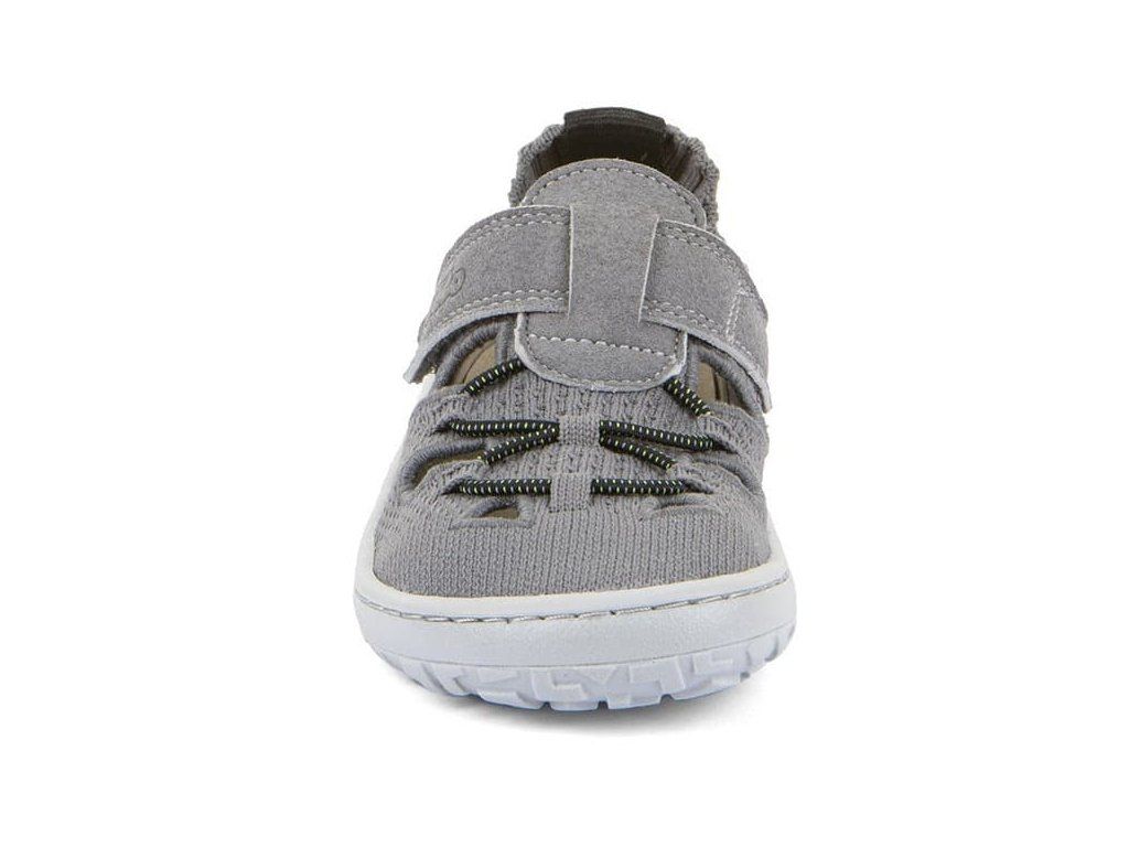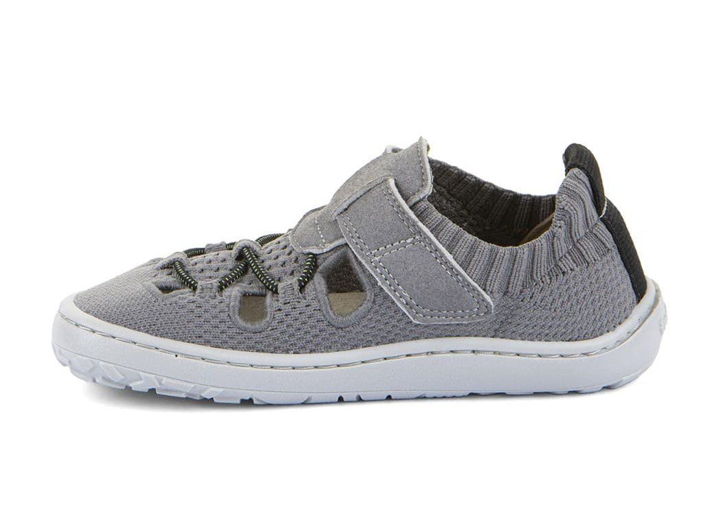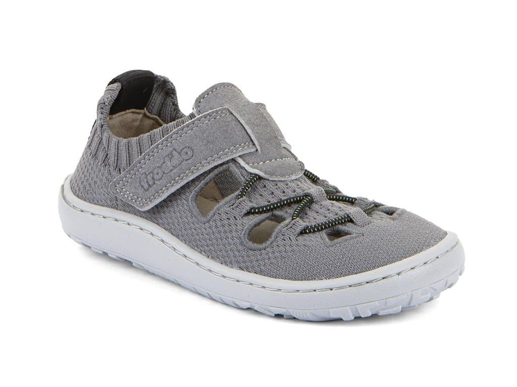 Stylové textilní barefoot sandále Froddo G3150296-2 se zapínáním na suchý zip pro snadné nazouvání. Ve spodní části je gumička, která ale nelze nijak utáhnout. V chlapecké šedé barvě. Boty mají flexibilní podrážku z přírodní gumy s jemným vzorkem.
