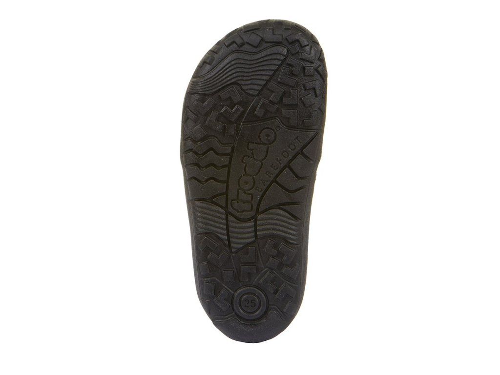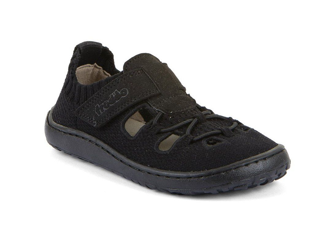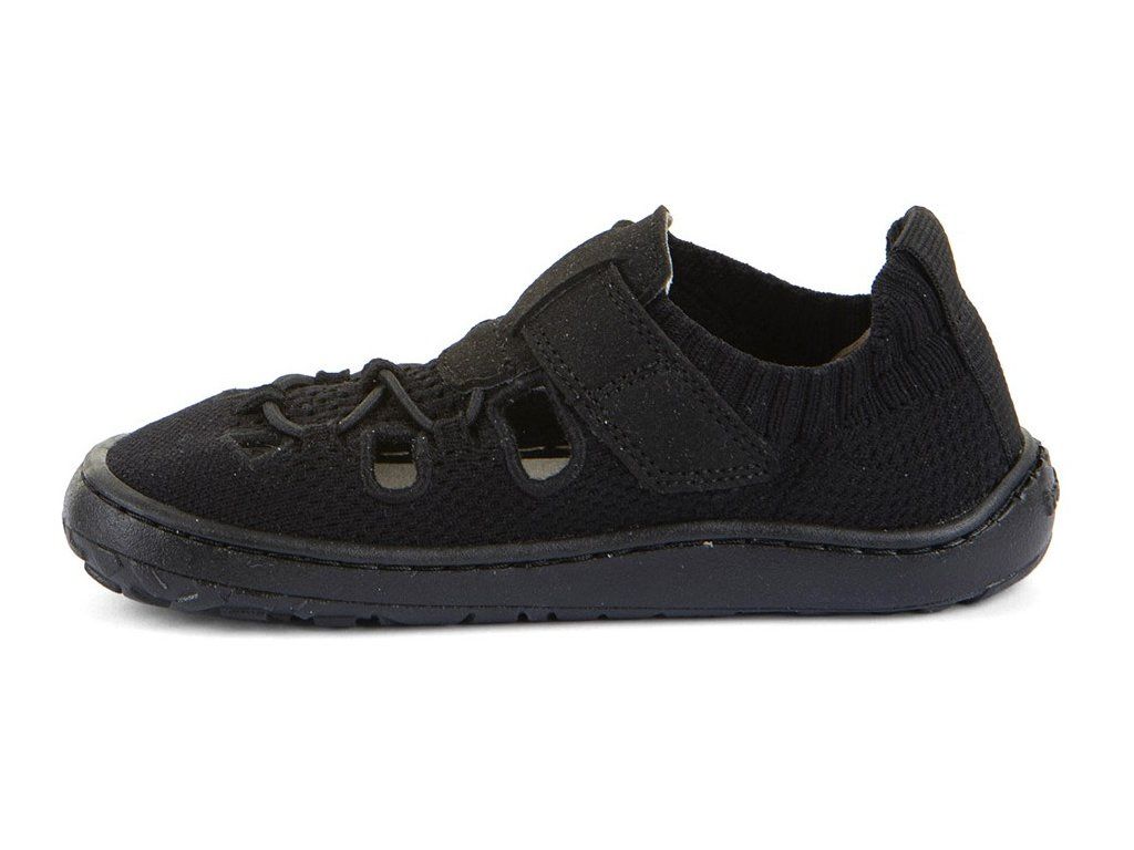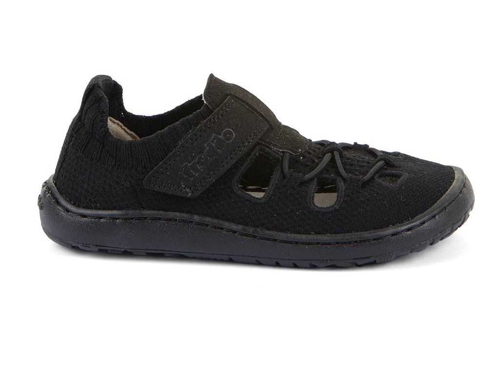 Stylové textilní barefoot sandále Froddo G3150296-7 se zapínáním na suchý zip pro snadné nazouvání. Ve spodní části je gumička, která ale nelze nijak utáhnout. V Unisex černé barvě. Boty mají flexibilní podrážku z přírodní gumy s jemným vzorkem.