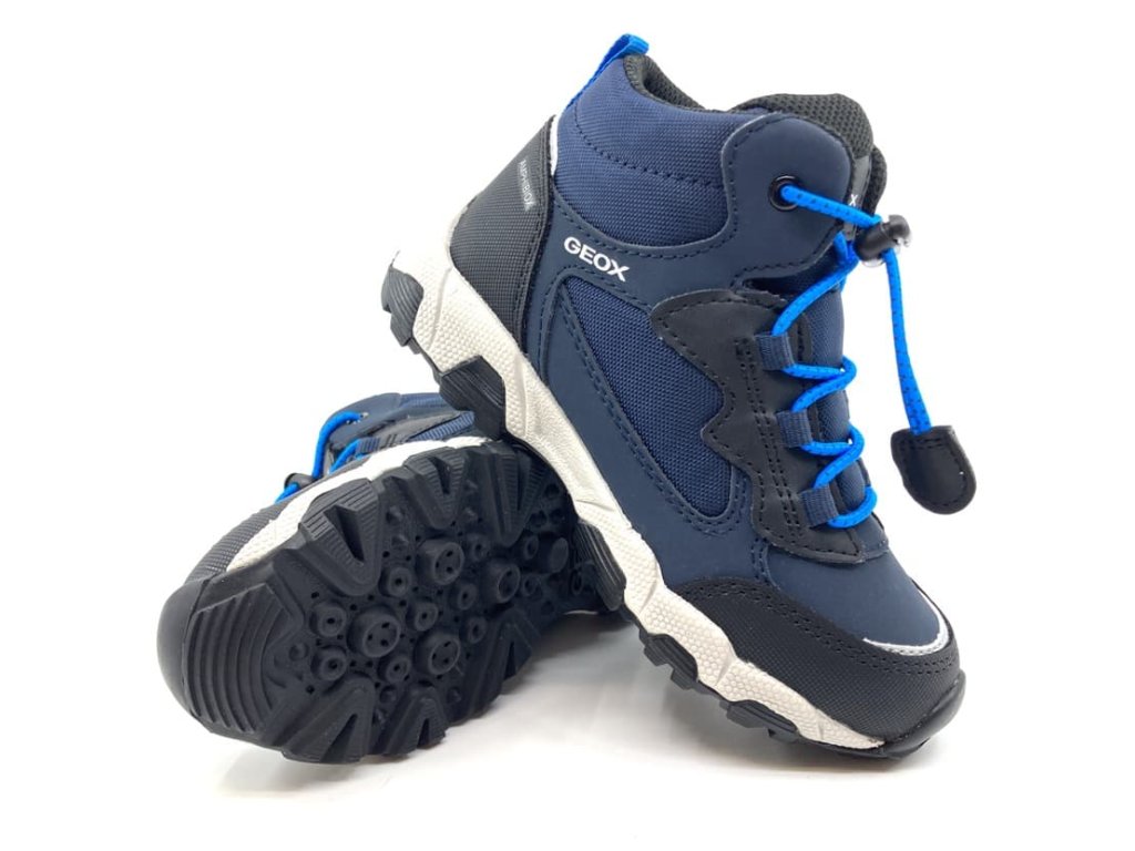 Chlapecká kotníková obuv Geox Magnetar Boy B.B ABX - Navy/ Sky v tmavě modré barvě barvě s výraznými modrými prvky. Tyto celoroční boty kombinují moderní design s pokročilými technologiemi pro maximální pohodlí a ochranu. Mají lehké zateplení fleecem, jsou tak ideální na podzim i teplejší zimu.