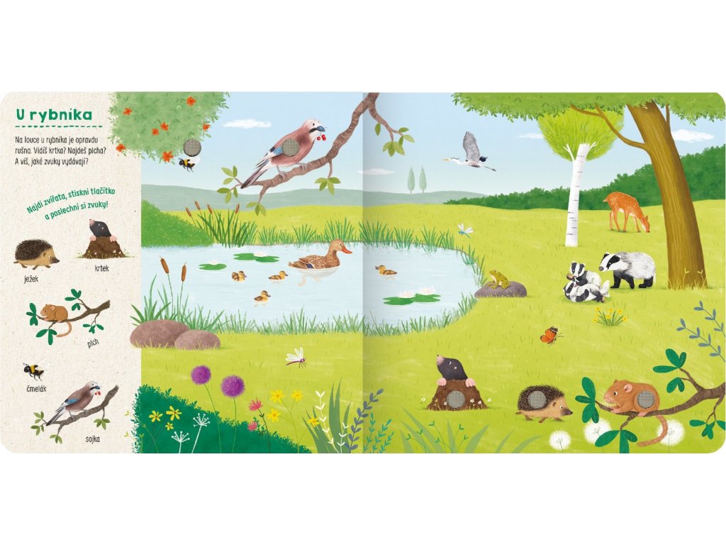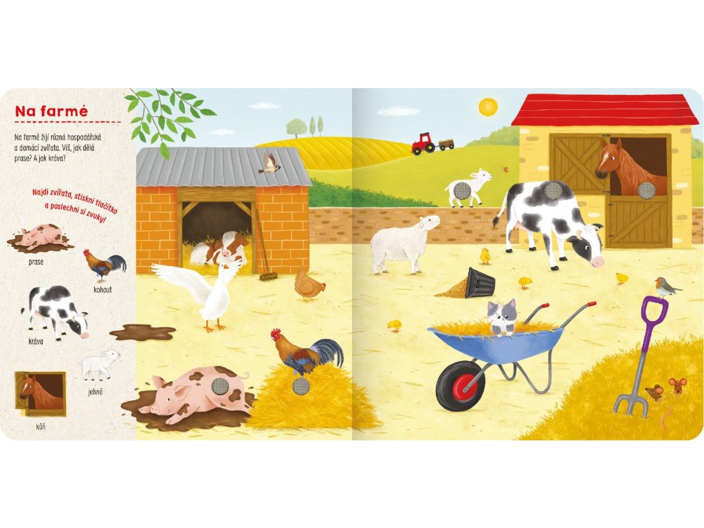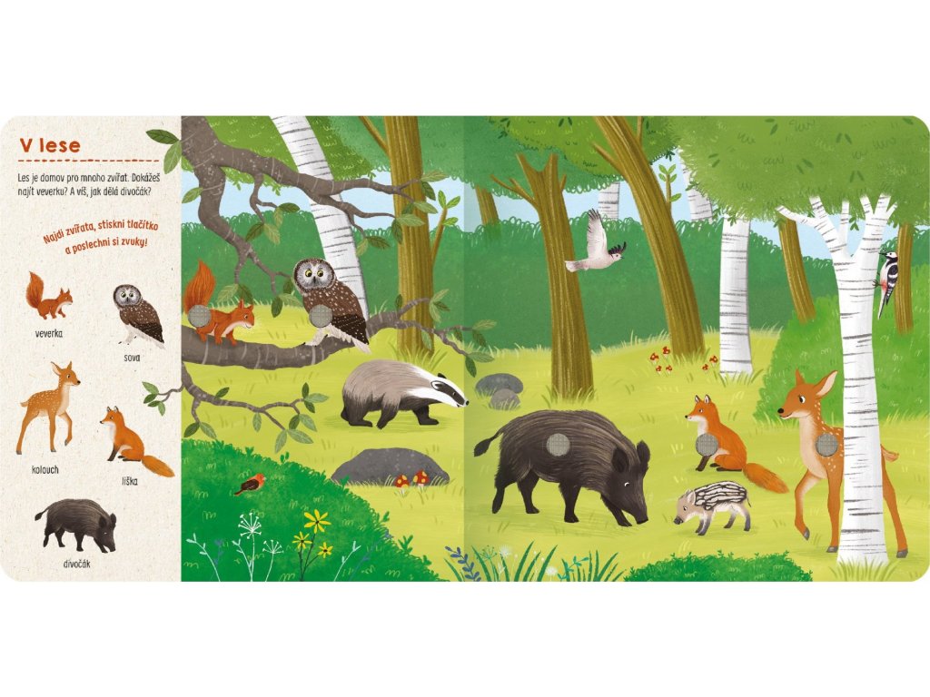 Vítej ve světě zvířat. Poznáš koloucha? Víš, jak dělá lev? A jak prase? Hledej a poznávej zvířata v této zvukové knize s pevnými stránkami v různých prostředích. Najdi zvířata, stiskni tlačítko a poslechni si zvuk, jaký vydávají. Tato roztomile ilustrovaná kniha představí dětem zvířata v jejich přirozeném prostředí a naučí je rozpoznávat podle zvuků.Doplňkové parametry