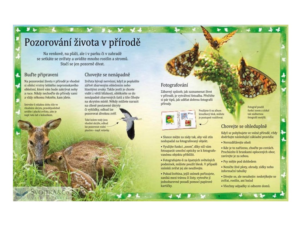 Na venkově, v parku, na zahradě, případně i na pláži se můžete setkat s různými živočichy a spatřit mnoho rostlin a stromů. Jak se ve všech těch druzích, barvách a tvarech zorientovat? Tato knížka se vás to pokusí zábavným způsobem naučit. Poradí, jak nejlépe život v přírodě pozorovat, obsahuje i pár rad, jak udělat co nejlepší fotografie. Ale hlavně v ní najdete velké množství podrobných informací o ptácích, stromech a květinách, hmyzu, slimácích i hlemýždích, motýlech, rybách, lasturách i korýších... Obsahuje velké množství barevných fotografií a realistických kreseb, všechny druhy jsou popsány "od hlavy až k patě"; dozvíte se zde veškeré informace o tom, jak a kde žijí, jak rostou a stárnou, čím se živí, jak se rozmnožují, případně jak pečují o mláďata, jak se mezi sebou "domlouvají", jaké zanechávají stopy, jaký mají tvar těla a zbarvení… Ale i to, jak je máte chránit a jaké o nich kolují mýty a legendy. V knížce se našlo i místo na zajímavosti, které se vám budou zdát neuvěřitelné, pověry spojené se zvířaty či rostlinami a květinovou symboliku. Přejeme vám při pozorování života v přírodě hodně krásných chvil. Stačí se jen pozorně dívat!