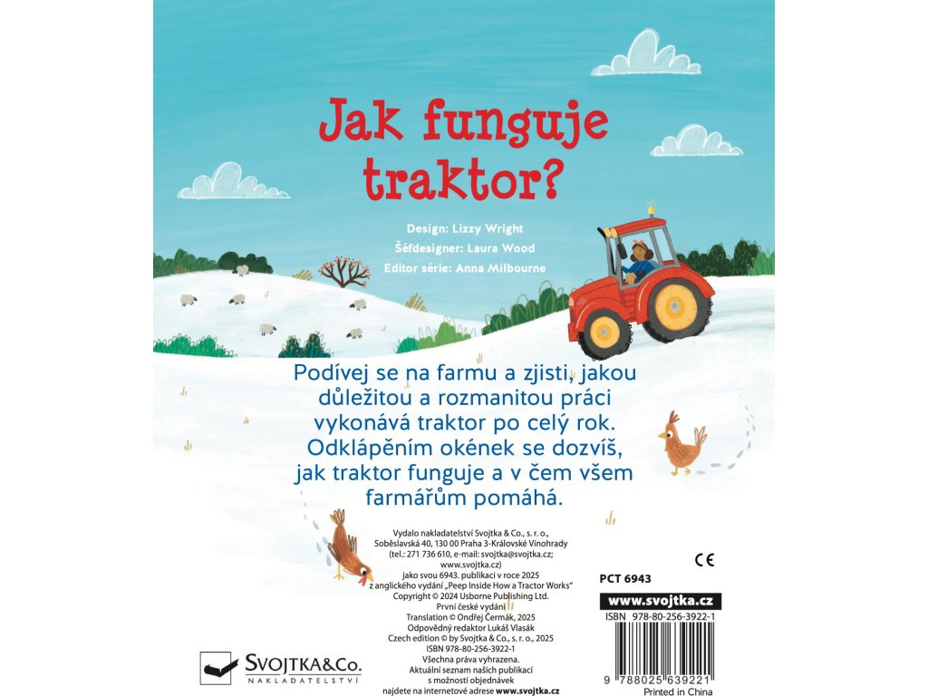 Chceš vědět, co všechno dokáže traktor na farmě? Tato interaktivní knížka tě vezme na fascinující cestu, která potrvá celý farmářský rok! Od přivážení sena v zimě po sklizeň obilných polí v létě – odklopuj okénka a zjisti, jak traktor pomáhá farmářům v každém ročním období. Nahlédni do kabiny, prozkoumej stroje v akci a pochop, jak funguje život na farmě. Ideální pro malé prstíky a zvídavé hlavičky, které milují techniku a chtějí se hravou formou dozvědět, co se děje na venkově. Perfektní úvod do světa zemědělských vozidel!České vydání publikace nakladatelství Usborne.