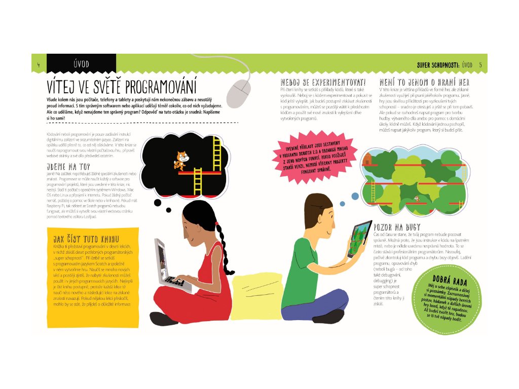 Chceš se naučit programovat, ale nevíš, jak začít? Knížka, kterou držíš v ruce, tě provede světem programování – od jednoduchého psaní instrukcí pomocí kódu v programu Scratch až po naprogramování vlastní počítačové hry, a dokonce i návrhu vlastních webových stránek. Projdi všech 10 lekcí, získej 10 programátorských super schopností a staň se mistrem v kódování.