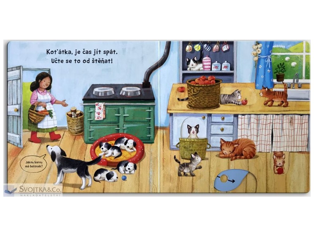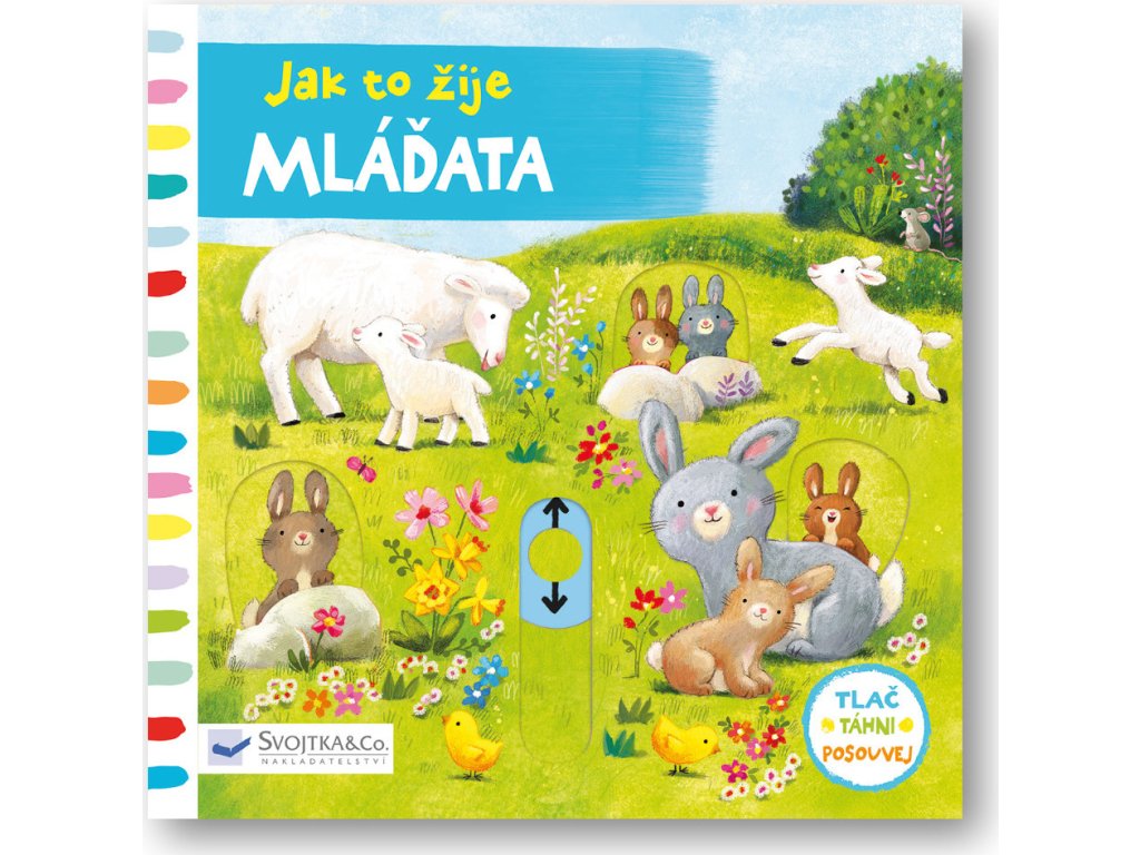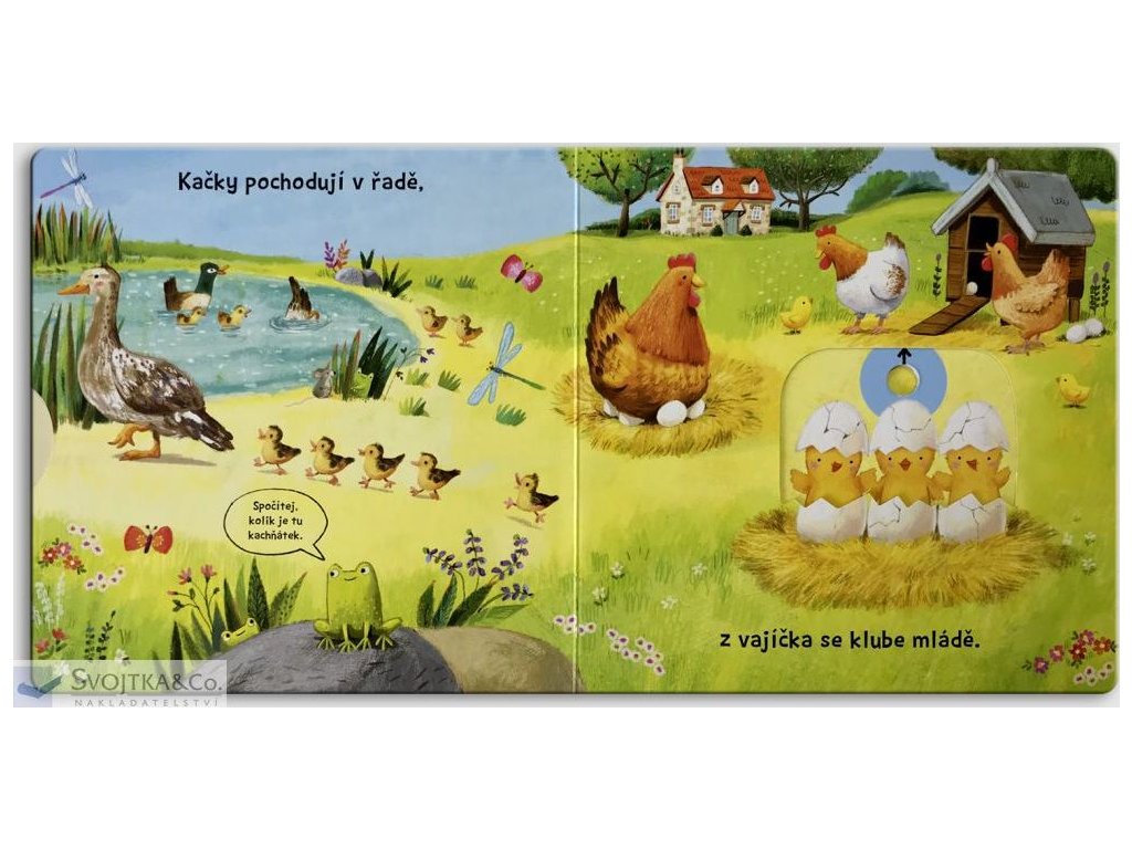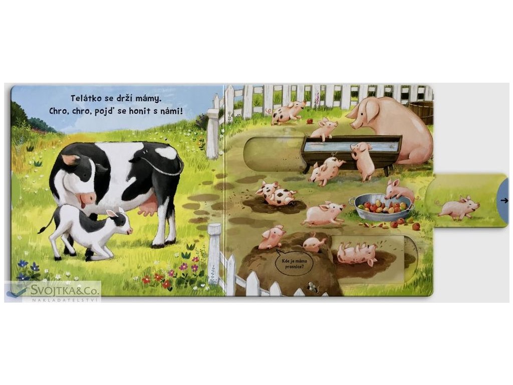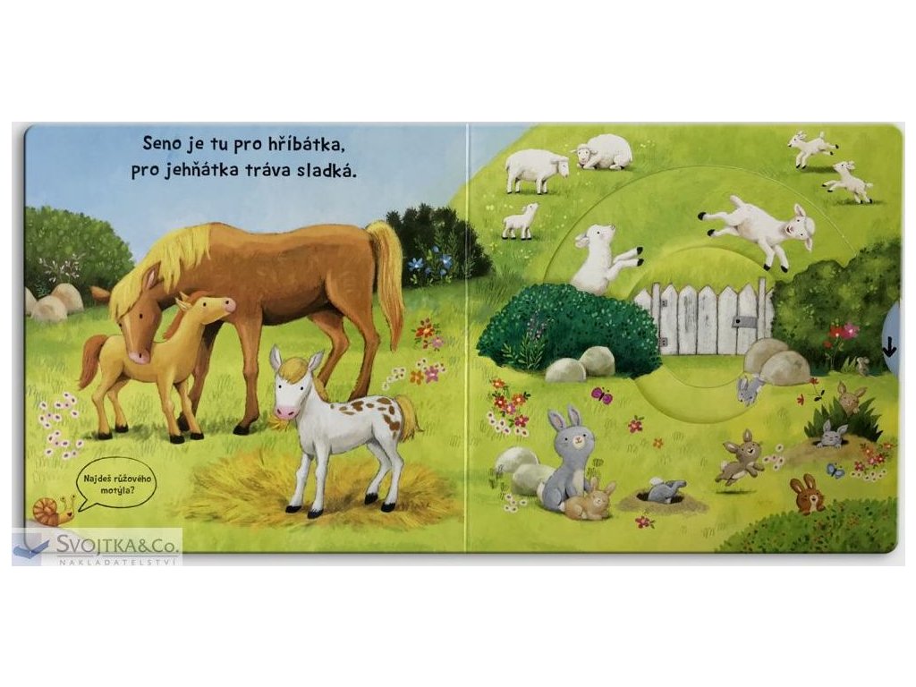 Seno je tu pro hříbátka, pro jehňátka tráva sladká. Najdeš růžového motýlka? Kuřata se klubou z vajec, štěňata se chystají spát, koťata si hrají. Prohlížej si stránky, pohybuj obrázky a uvidíš, jak to žije mezi mláďaty. Toto veršované leporelo je určeno dětem od jednoho roku. Má pevné stránky s posuvnými a otočnými prvky, a tak si dítě při prohlížení knížky současně procvičí jemnou motoriku - může na jednotlivých stránkách posouvat, tahat, otáčet. Objeví nové věci a můžete si o nich společně povídat. Tak honem, zvířecí mláďata vyvádějí tolik zajímavých věcí - pojď se na to podívat!Doplňkové parametry