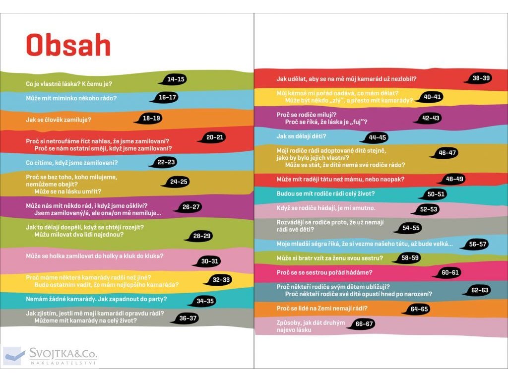 Budou se mít rodiče rádi celý život? K čemu je vlastně láska? Můžeme mít kamarády na celý život? Láska a přátelství vyvolávají u dětí celou řadu otázek. Některé z nich mohou vzbuzovat rozpaky a dospělí na ně nemají vždy odpověď. Tato knížka se snaží vhodnými slovy vysvětlit dětem velkou záhadu jménem láska. Upozorňuje je na emoce, které může láska přinášet, a pomáhá jim co nejvyrovnaněji přejít z dětství do puberty. Pro kluky a holky od 7 let.