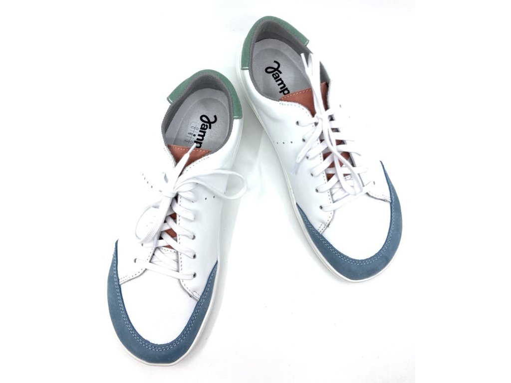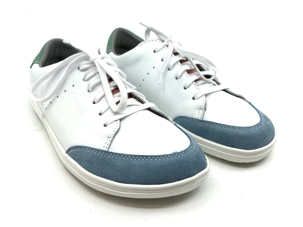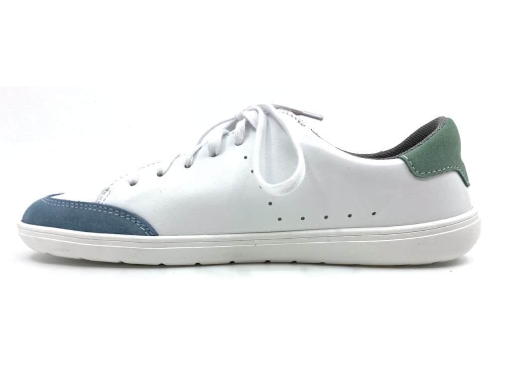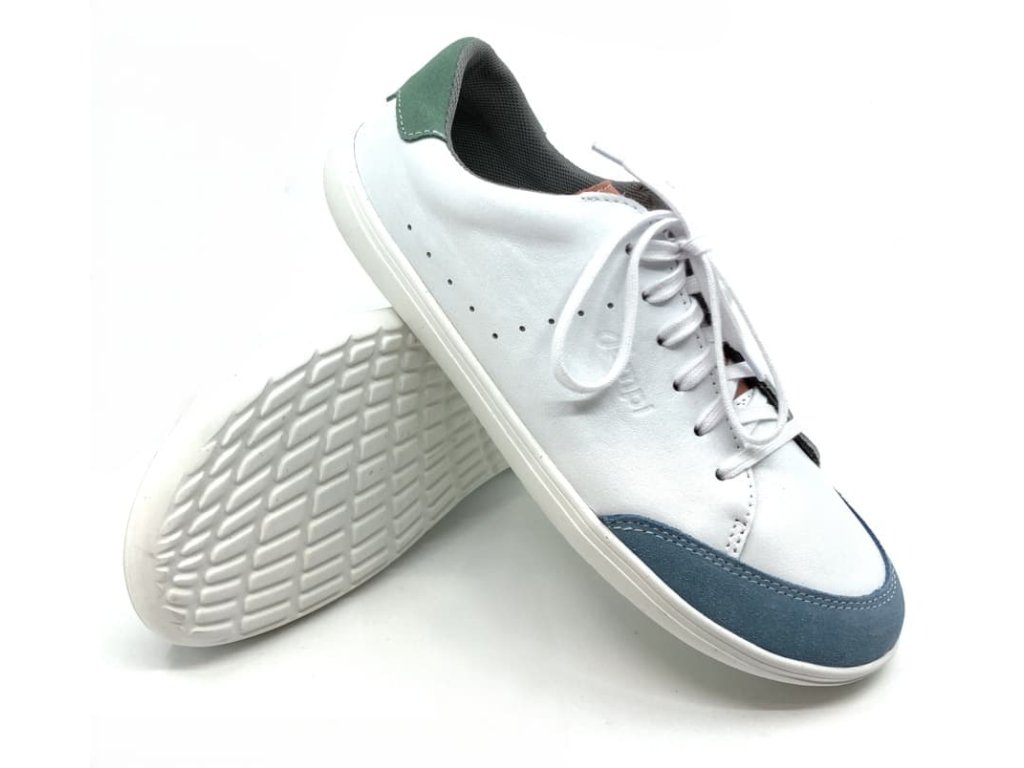 Kožené barefoot Jonap šedomodrá v kombinaci bílo šedo a zelené barvy. Tyto barefoot tenisky jsou na nové, odolné podrážce z pravé gumy (2024), která je měkká a výborně ohebná všemi směry.