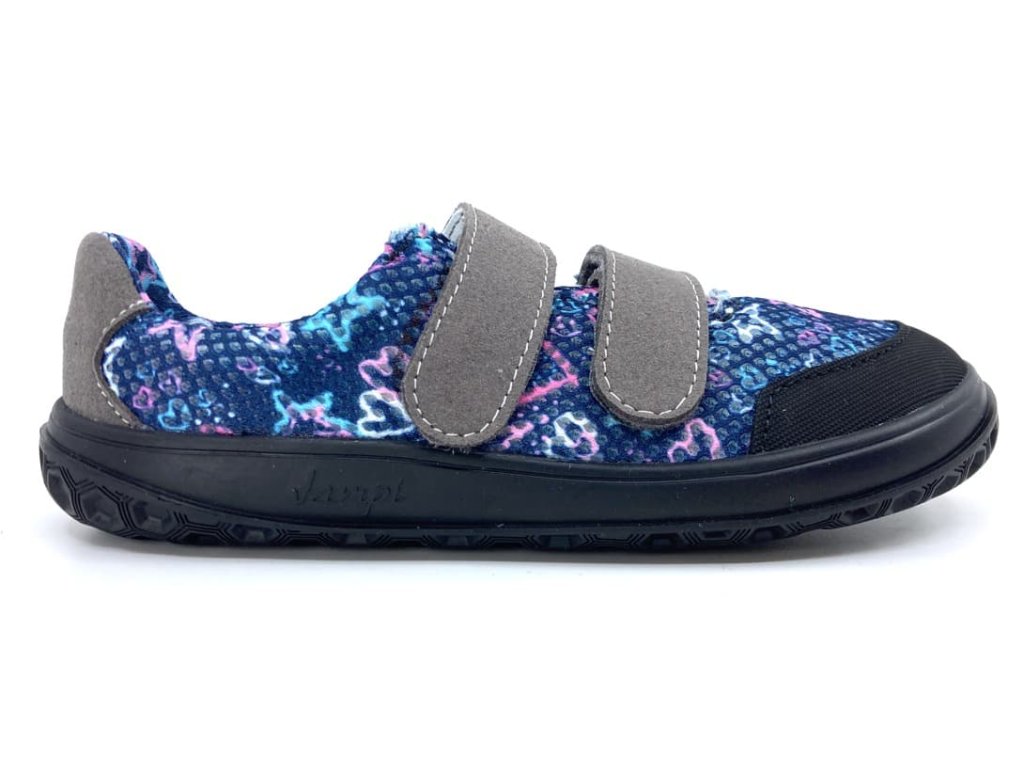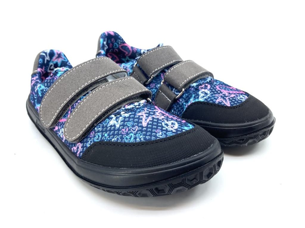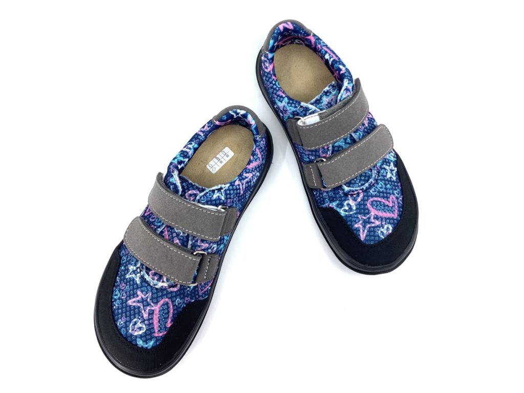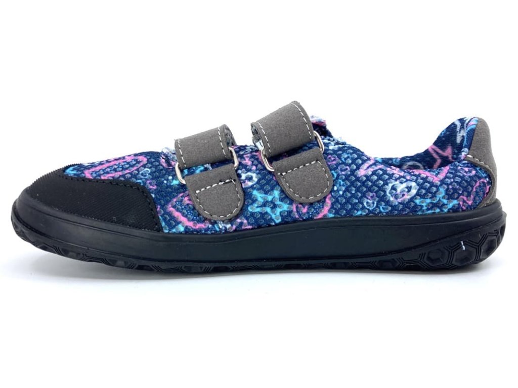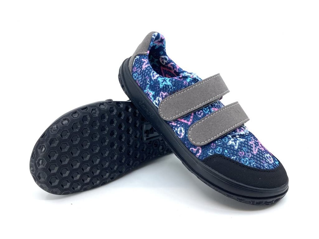 Prodyšné dívčí barefoot tenisky Jonap B18 modrá srdce modré barvy s motivem srdcí, z textilního materiálu, který je perfektně prodyšný a skvěle zvládne i parné počasí. Odolnost zajišťuje okop z mikrovlákna. Botu přitáhnete k noze dvěma suchými zipy. Přední část boty má výraznější prostor pro prsty. Jsou tedy vhodné i pro dominatní palec. Kolem kotníku se dají krásně utáhnout.