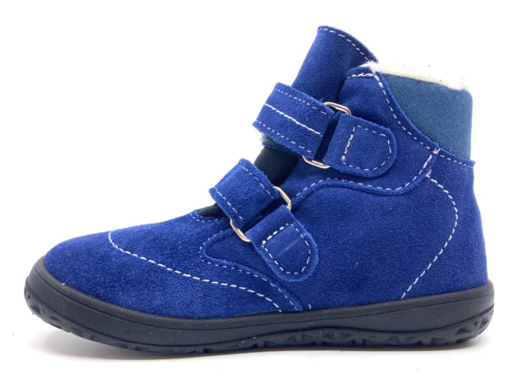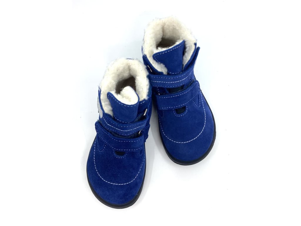 Dětské zimní barefoot boty Jonap B5S v chlapecké modré barvě. Boty jsou vyššího střihu, končí několik cm nad kotníkem. Vnější vrstva je z broušené kůže (velur), vnitřek je zateplený kožíškem, který je příjemně měkký a oproti jiným nekouše. Na poměry zimních barefoot bot tak jsou opravdu teplé, a díky membráně Te-Por i nepromokavé.