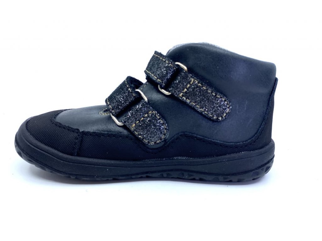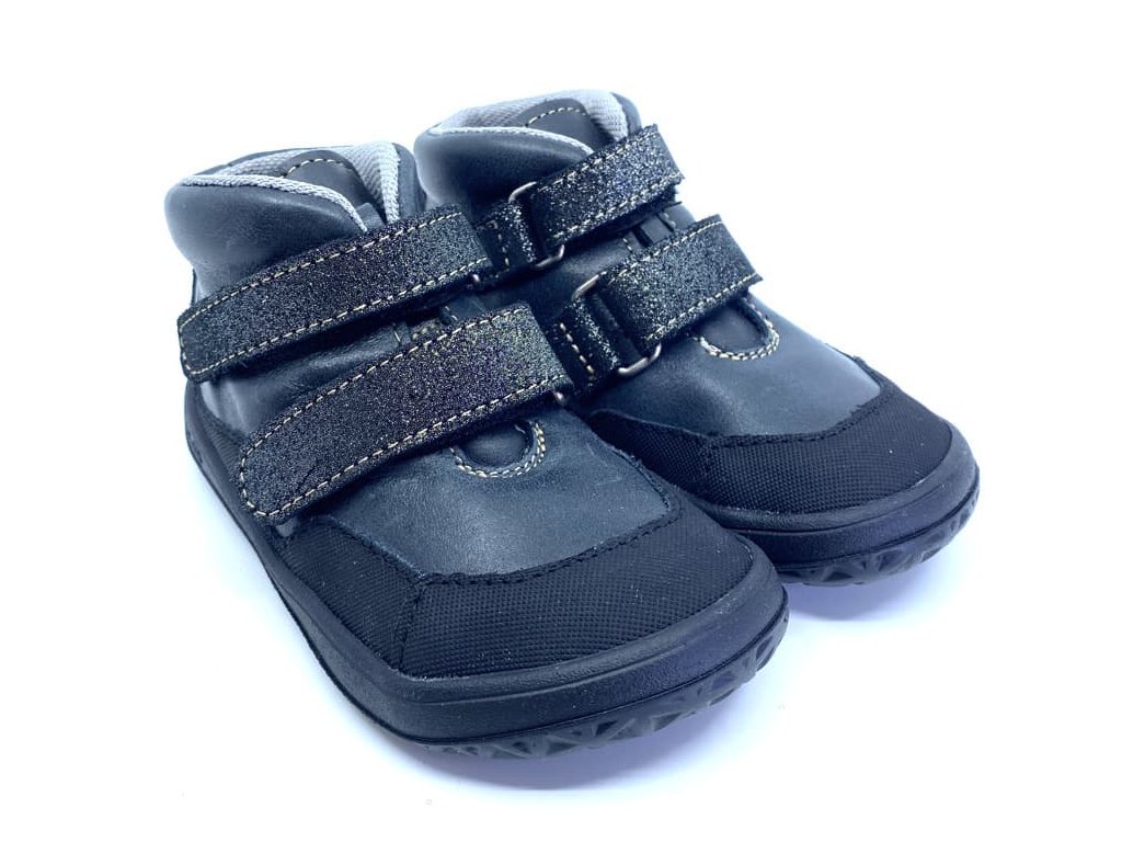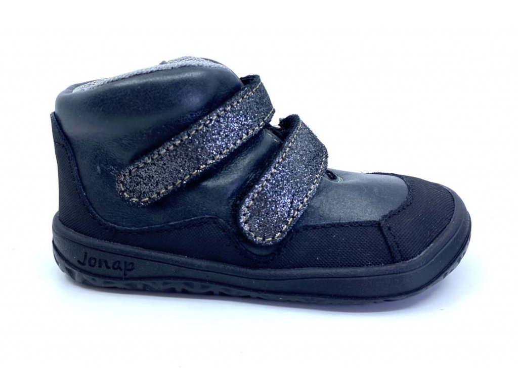 Dětské celoroční kožené barefoot boty Jonap Bella M v černé barvě jsou vyššího střihu, končí těsně nad kotníkem. Svršek je z hladké kůže, podšívka textilní a příjemně měkká. Opatek je mírně zpevněný. Okolo celé boty je praktický okop z pogumované kůže s jemným vzorem - botky tak déle vydrží jako nové, a zároveň okop zvyšuje odolnost proti promoknutí např. v mokré trávě.