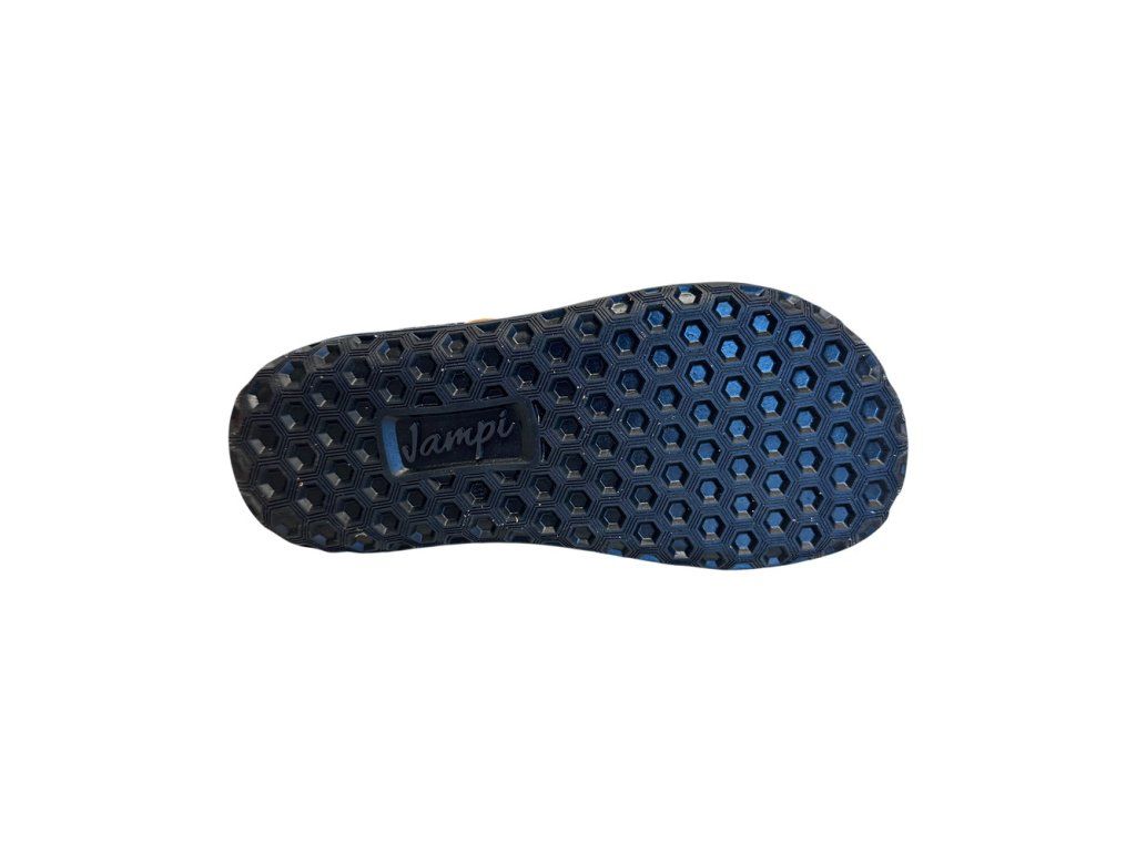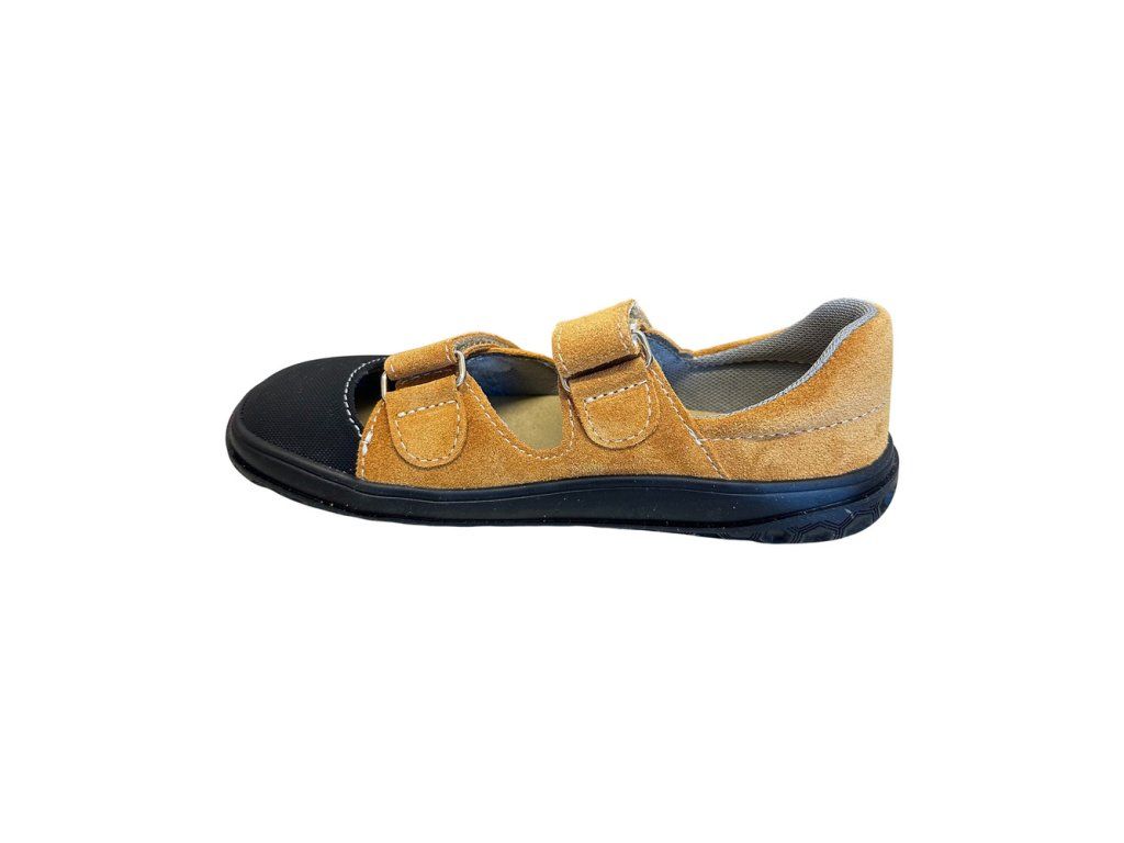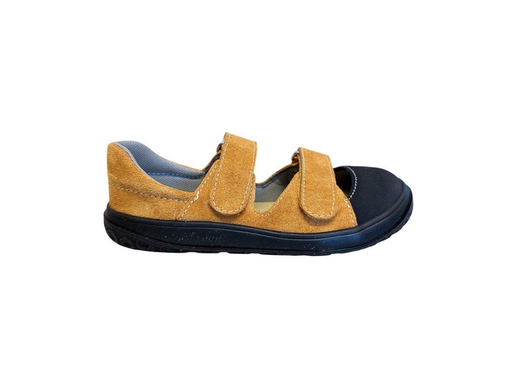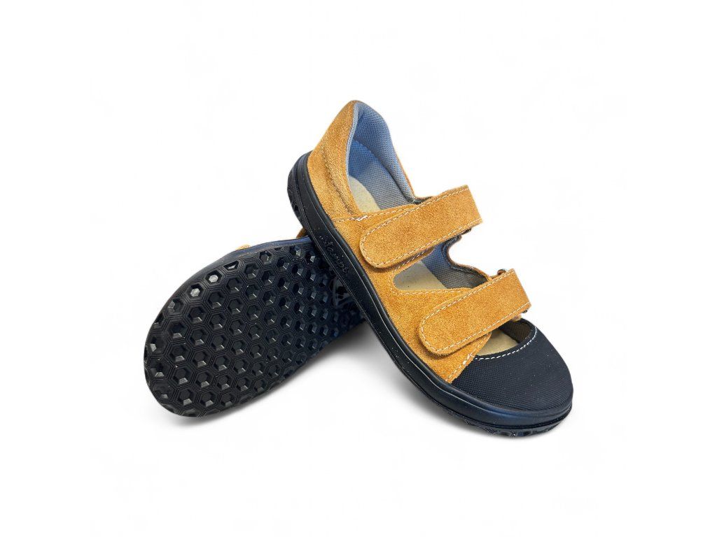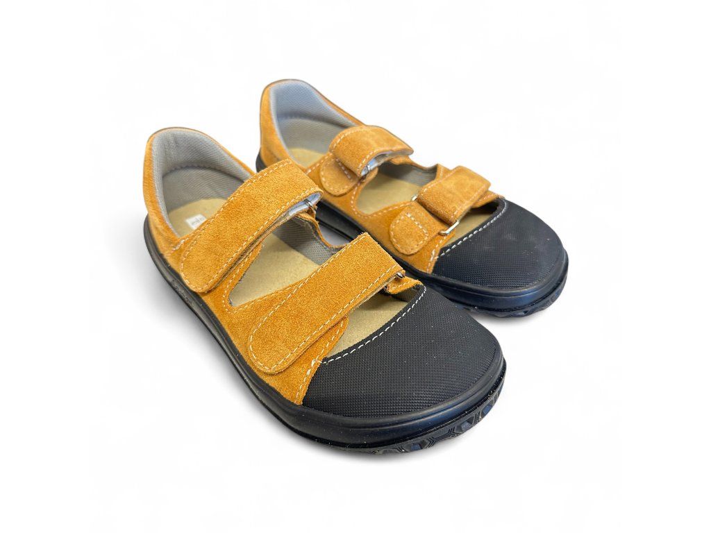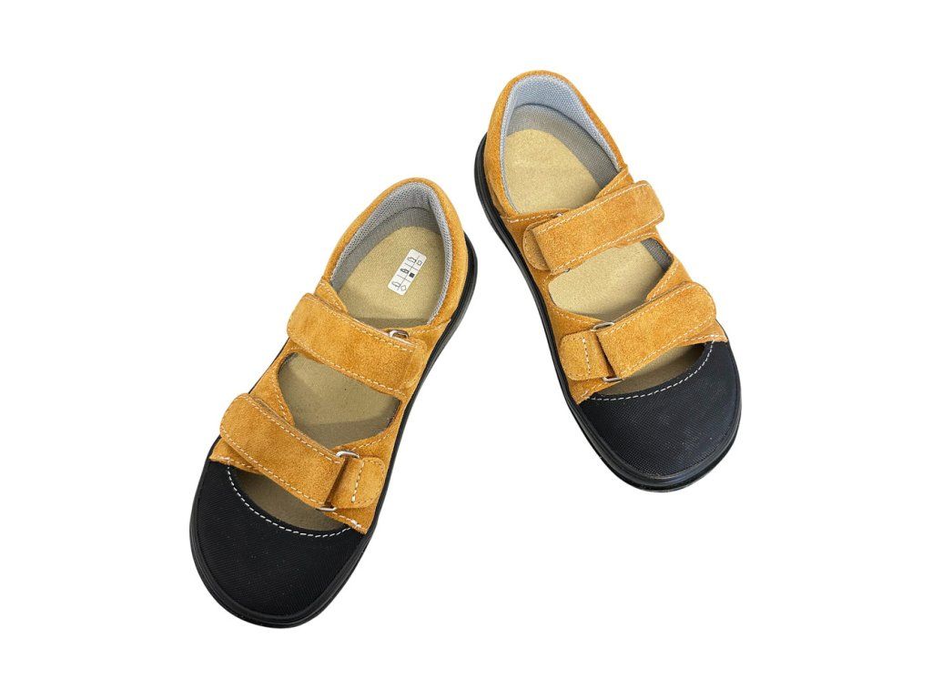 Kožené dětské barefoot sandále Jonap B21 s textilní podšívkou. V hořčicové barvě - velur potištěný strukturou textilu s odolnou špičkou z pogumované kůže. Přední část boty má výraznější prostor pro prsty. Jsou tedy vhodné i pro dominatní palec. Regulace v nártu a kotníku dvěma suchými zipy.