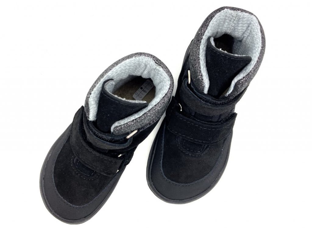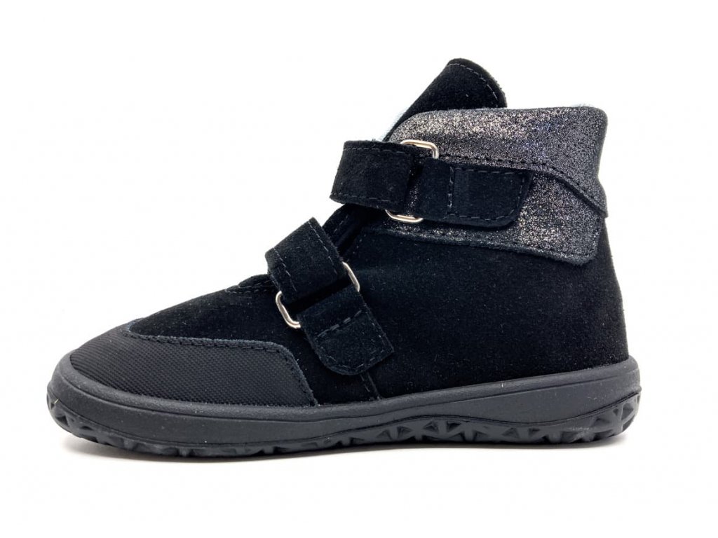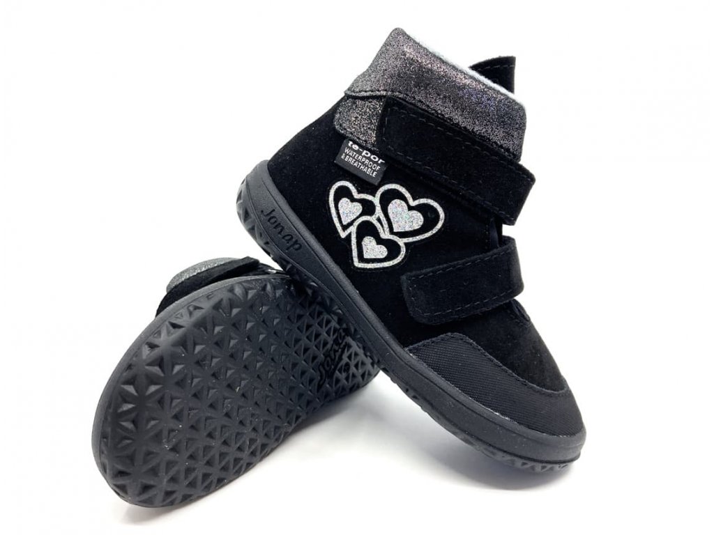 Dětské celoroční kožené barefoot boty Jonap Jerry v černé barvě se stříbrnými srdíčky. Boty jsou vyššího střihu, končí těsně nad kotníkem. Vnější vrstva je z velurové kůže, vnitřní podšívka je příjemná a zároveň teplejší - do podzimního počasí idální. Navíc díky membráně Te-por jsou boty nepromokavé a zároveň prodyšné. Opatek je zpevněný výztuhou. Přední část lemuje je praktický kožený okop s jemným vzorem - botky tak déle vydrží jako nové.