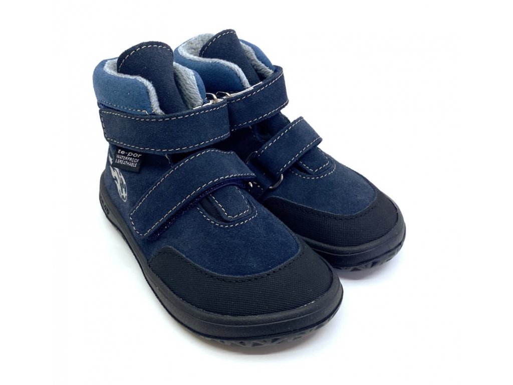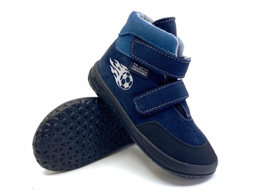 Dětské celoroční kožené barefoot boty Jonap Jerry v tmavě modré barvě s reflexním motivem fotbalového míče. Boty jsou vyššího střihu, končí těsně nad kotníkem. Vnější vrstva je z velurové kůže, vnitřní podšívka je příjemná a zároveň teplejší - do podzimního počasí idální. Navíc díky membráně Te-por jsou boty nepromokavé a zároveň prodyšné. Opatek je zpevněný výztuhou. Přední část lemuje je praktický kožený okop s jemným vzorem - botky tak déle vydrží jako nové.