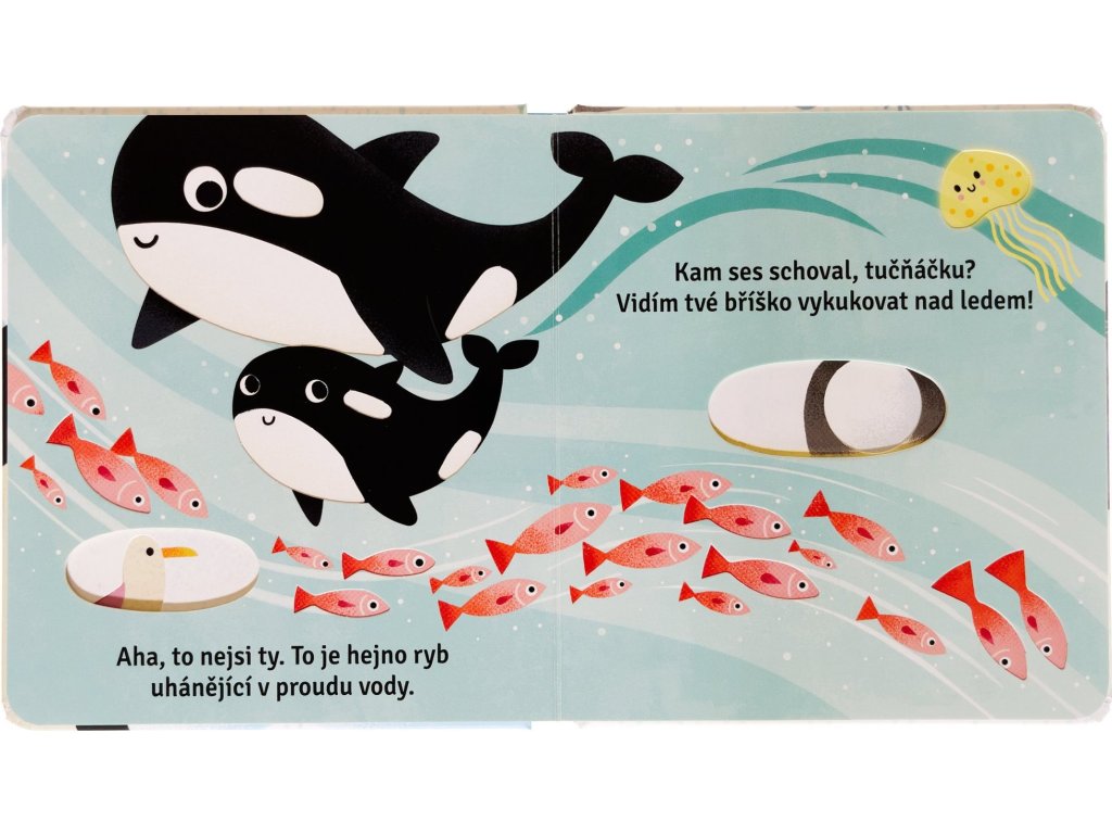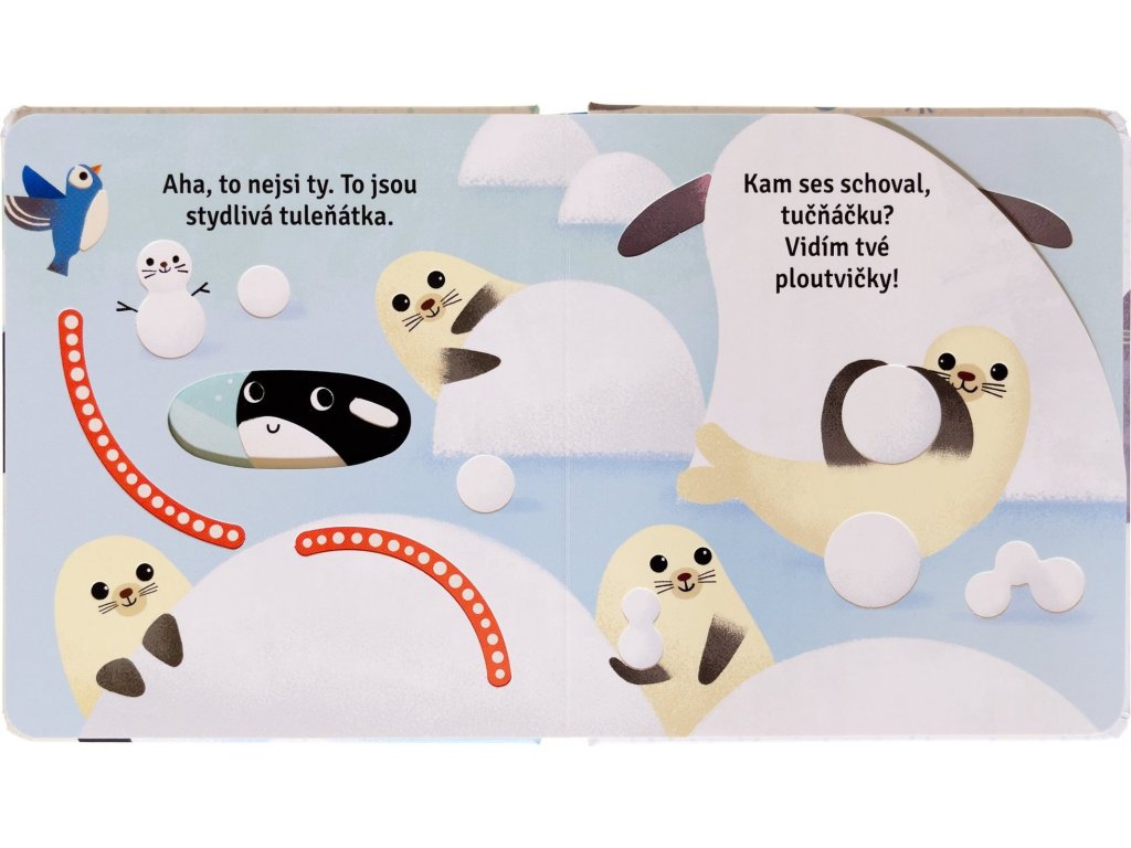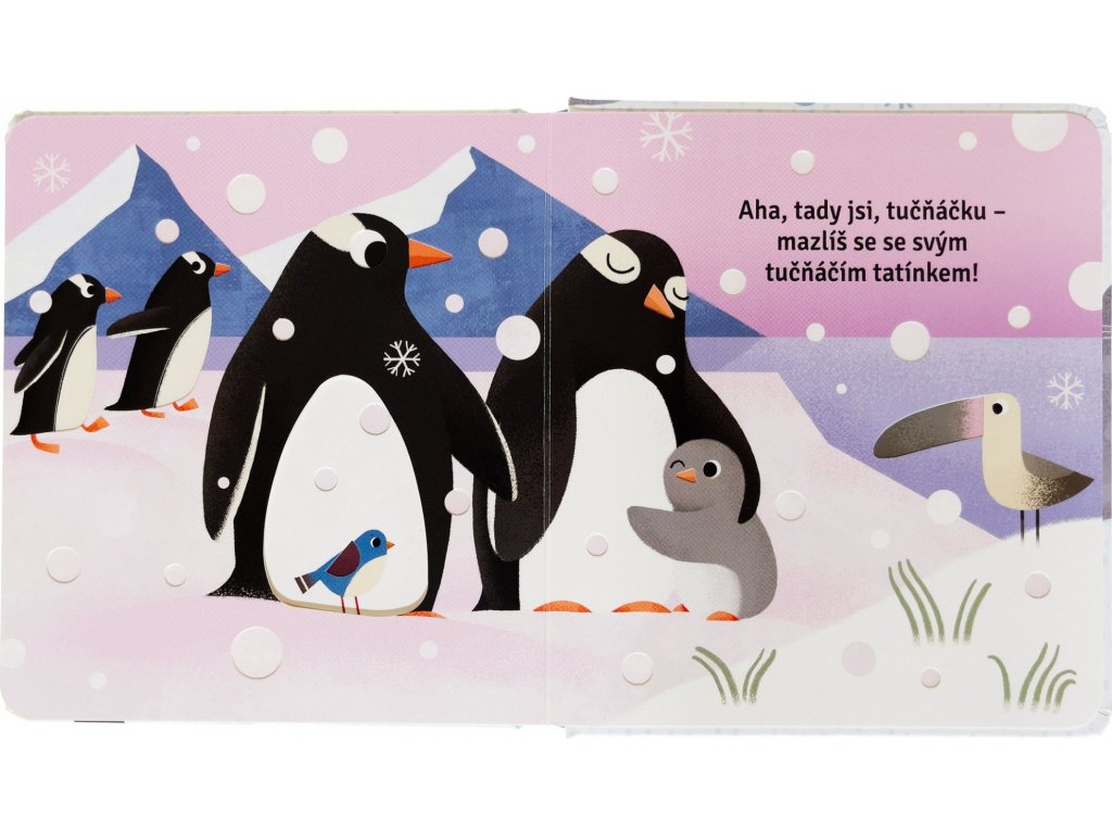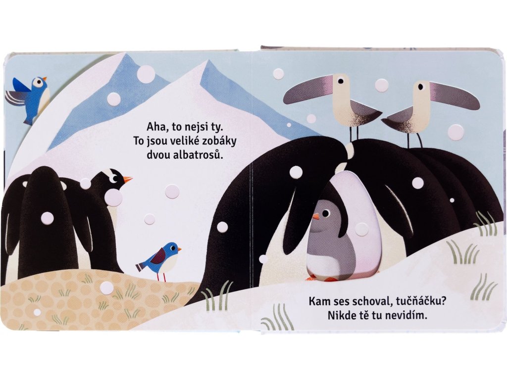 Kniha pro nejmenší děti, která jim jistě udělá radost. Užijte si společné chvíle při listování knihou a hledejte okouzlujícího tučňáčka. Je za haldou sněhu? Nebo plave v ledové vodě? Kam se schoval tentokrát? Děti jistě potěší, že mohou nakukovat skrz výřezy do dalších stránek. Šikovně umístěné výřezy navíc dávají obrázkům nový rozměr – možná není vše na obrázku takové, jak se to na první pohled zdá. Kniha je vytvořena z pevného materiálu, který vydrží i neopatrné zacházení malých nezbedníků. Tak hurá do objevování!Doplňkové parametry