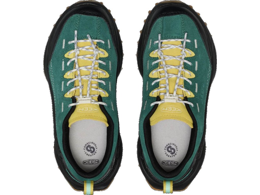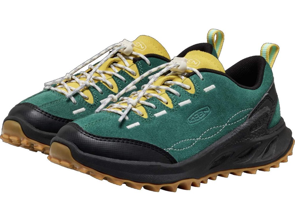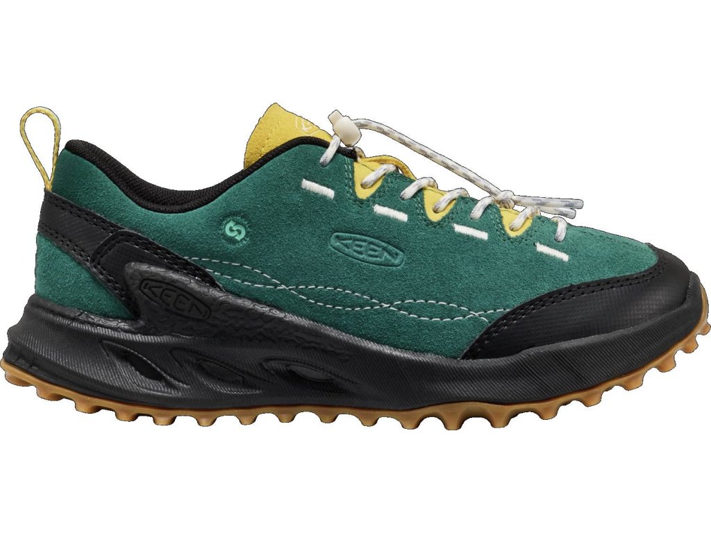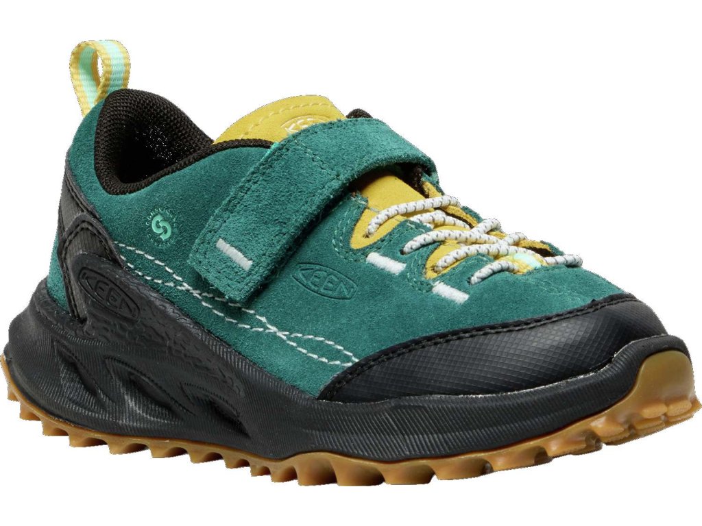 Keen Jasper Zionic Mediterranea/Cabbage je sportovně-outdoorová bota, která se skvěle hodí pro aktivní pohyb v terénu. Do velikosti 31 je zapínání na suchý zip, od velikosti 32/33 je utahování na gumičku, není tak potřeba nic zavazovat.