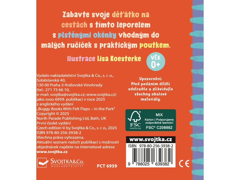 Tato menší knížka s plstěnými okénky zaujme nejmenší děti. Díky vhodné velikosti a měkkým okénkům leporelo napomůže s rozvojem zraku, hmatu i motorických schopností. Děti se seznámí se zvířátky, které mohou potkat na procházce, a praktické poutko zajistí, že knížečka bude miminku vždy po ručce.Doplňkové parametry
