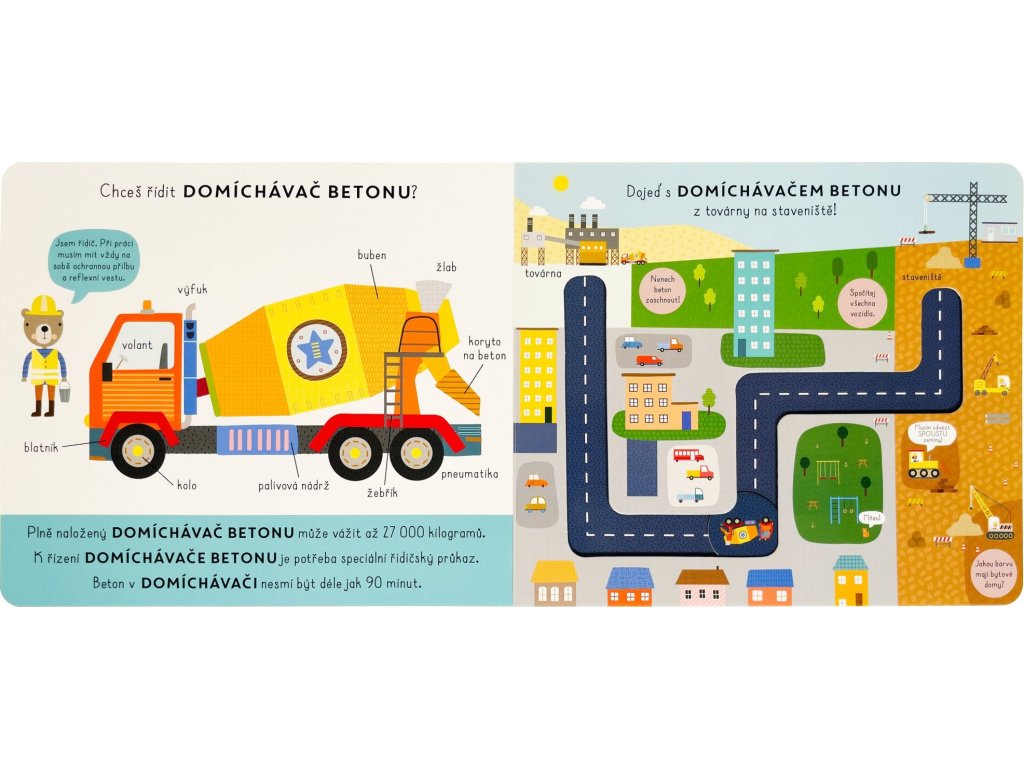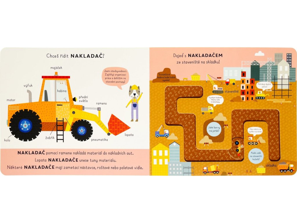 Zjisti o stavebních strojích spoustu zajímavostí a pomocí popisků u každého z nich se dozvíš, z čeho se skládají. Poté se s posuvnými kolečky můžeš projet po trasách po nejrůznějších staveništích a poznat i je! Víš, kolik může vážit domíchávač betonu? Jak se řídí bagr a kde se na nakladači nachází lopata? To a spoustu dalšího se dozvíš v tomto hravém, ale i velmi poučném leporelu s posuvnými kolečky.Doplňkové parametry