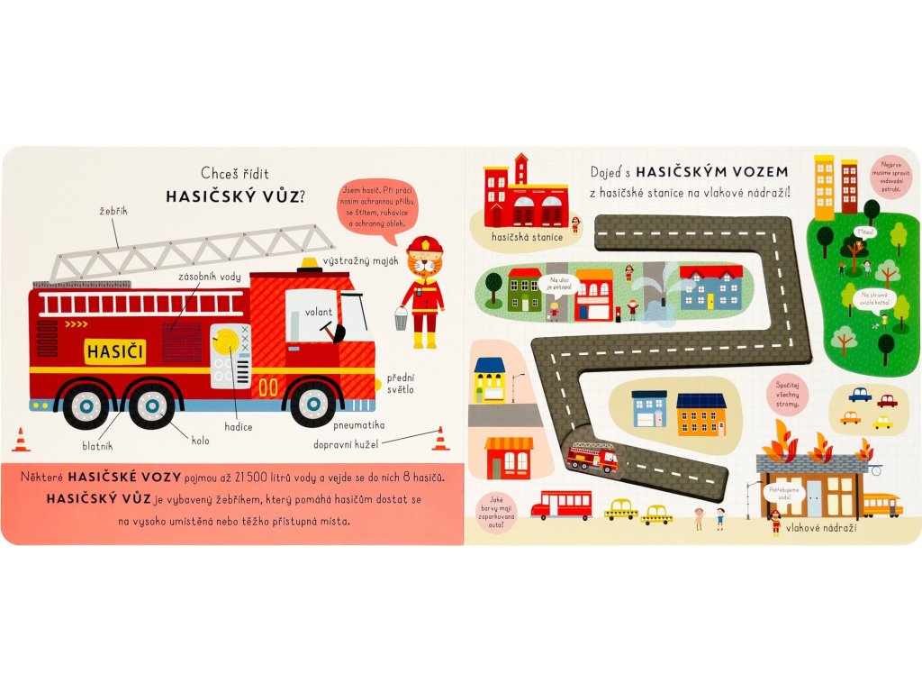 Zjisti o záchranářích a jejich strojích a vozidlech spoustu zajímavostí a pomocí popisků u každého z nich se dozvíš, z čeho se skládají. Poté se s posuvnými kolečky můžeš projet po trasách a zjistit, co všechno patří k práci záchranářů, hasičů a policistů. Kolik vody může pojmout hasičský vůz? Pomocí čeho houká policejní vůz? A kdo může řídit sanitku? To a spoustu dalšího se dozvíš v tomto hravém, ale i velmi poučném leporelu s posuvnými kolečky.Doplňkové parametry