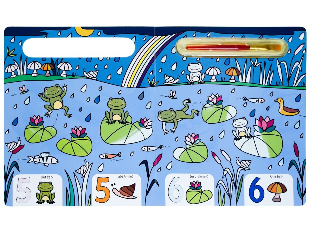Knížka s pevnými stránkami je plná obrázků z přírody, které jsou částečně barevné. Bílé části lze velice snadno vybarvit - stačí namočit štětec, který je součástí knihy, do vody a barva se jako zázrakem na bílém podkladě objeví. To ale není všechno! Vymalovaný obrázek jako kouzlem zmizí, a tak jej dítě může vymalovávat stále dokola. Zkontrolujte, zda dítě drží štětec správně. Současně si dítě může osvojit poznávání čísel od 1 do 10 a obrázky hledat i spočítat! S touto knížkou si bude procvičovat jemné motorické schopnosti, koordinaci oka a ruky a základy počítání.Doplňkové parametry