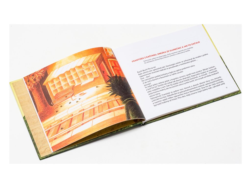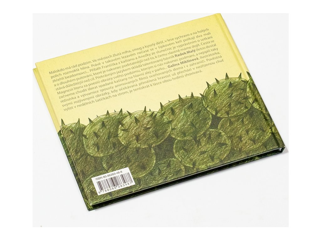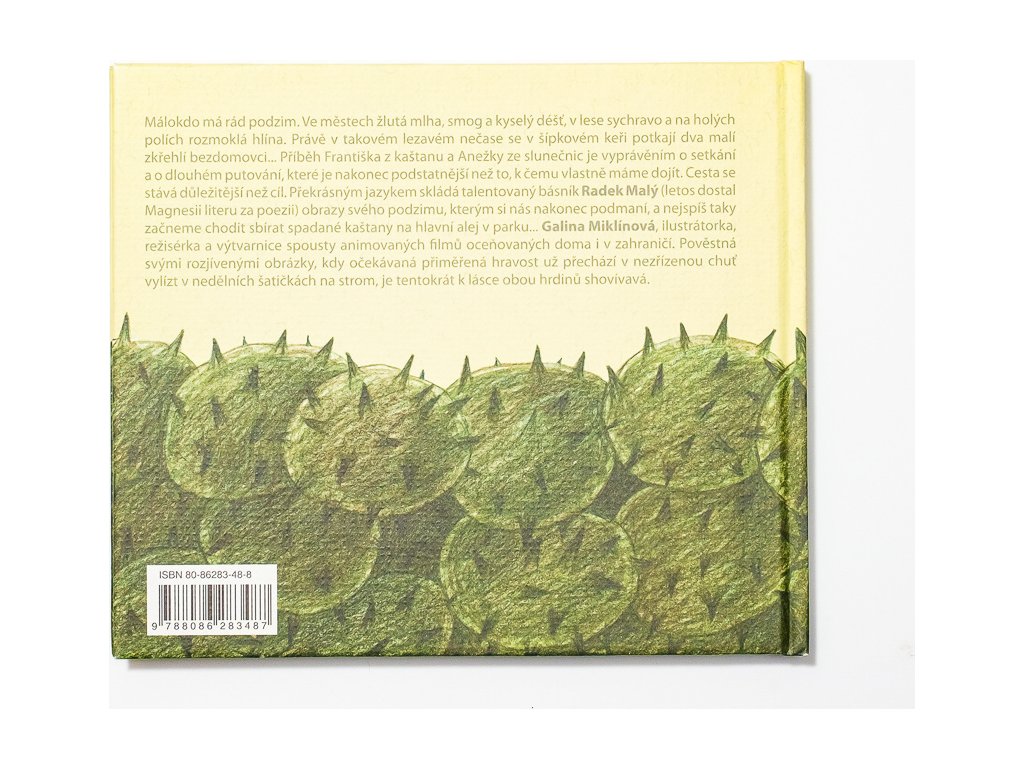 Málokdo má rád podzim. Ve městech se válí žlutá mlha, smog a padá kyselý déšť, v lese je sychravo a na holých polích rozmoklá hlína. Právě v takovém lezavém nečase se v šípkovém keři potkají dva malí zkřehlí bezdomovci. Příběh Františka z kaštanu a Anežky ze slunečnic je vyprávěním o setkání a o dlouhém putování, které je nakonec podstatnější než to, k čemu vlastně máme dojít. Talentovaný básník Radek Malý, oceněný Magnesií Literou za poezii, maluje překrásným jazykem obrazy svého podzimu, kterým si nás nakonec podmaní a díky němuž nejspíš taky začneme chodit sbírat spadané kaštany do hlavní aleje v parku. Galina Miklínová je ilustrátorka, režisérka a výtvarnice spousty animovaných filmů oceňovaných doma i v zahraničí. Je pověstná svými rozjívenými obrázky a s hravostí sobě vlastní zachycuje lásku obou hlavních hrdinů.